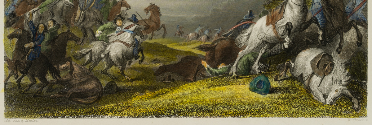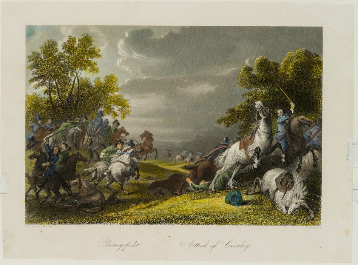 • Beschreibung: Bezeichnet unten links “Ad. van d. Meulen”, bezeichnet unten rechts “W. French sc.”, benannt “Reitergefecht”. In einer Ebene im Vordergrund werden die Betrachtenden Zeugen eines Gefechts. Zahlreiche Reiter stehen sich gegenüber, duellieren sich oder sind bereits zu Boden gegangen. Ihr blauen und grünen Gewänder weisen sie als sich gegenüberstehende Gegner aus. Im Hintergrund ergreift eine Gruppe Reiter die Flucht.