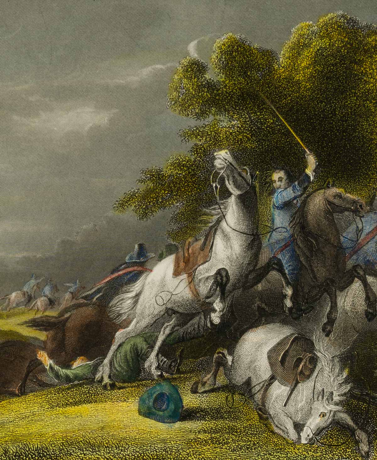 Bezeichnet unten links “Ad. van d. Meulen”, bezeichnet unten rechts “W. French sc.”, benannt “Reitergefecht”. In einer Ebene im Vordergrund werden die Betrachtenden Zeugen eines Gefechts. Zahlreiche Reiter stehen sich gegenüber, duellieren sich oder sind bereits zu Boden gegangen. Ihr blauen und grünen Gewänder weisen sie als sich gegenüberstehende Gegner aus. Im Hintergrund ergreift eine Gruppe Reiter die Flucht.