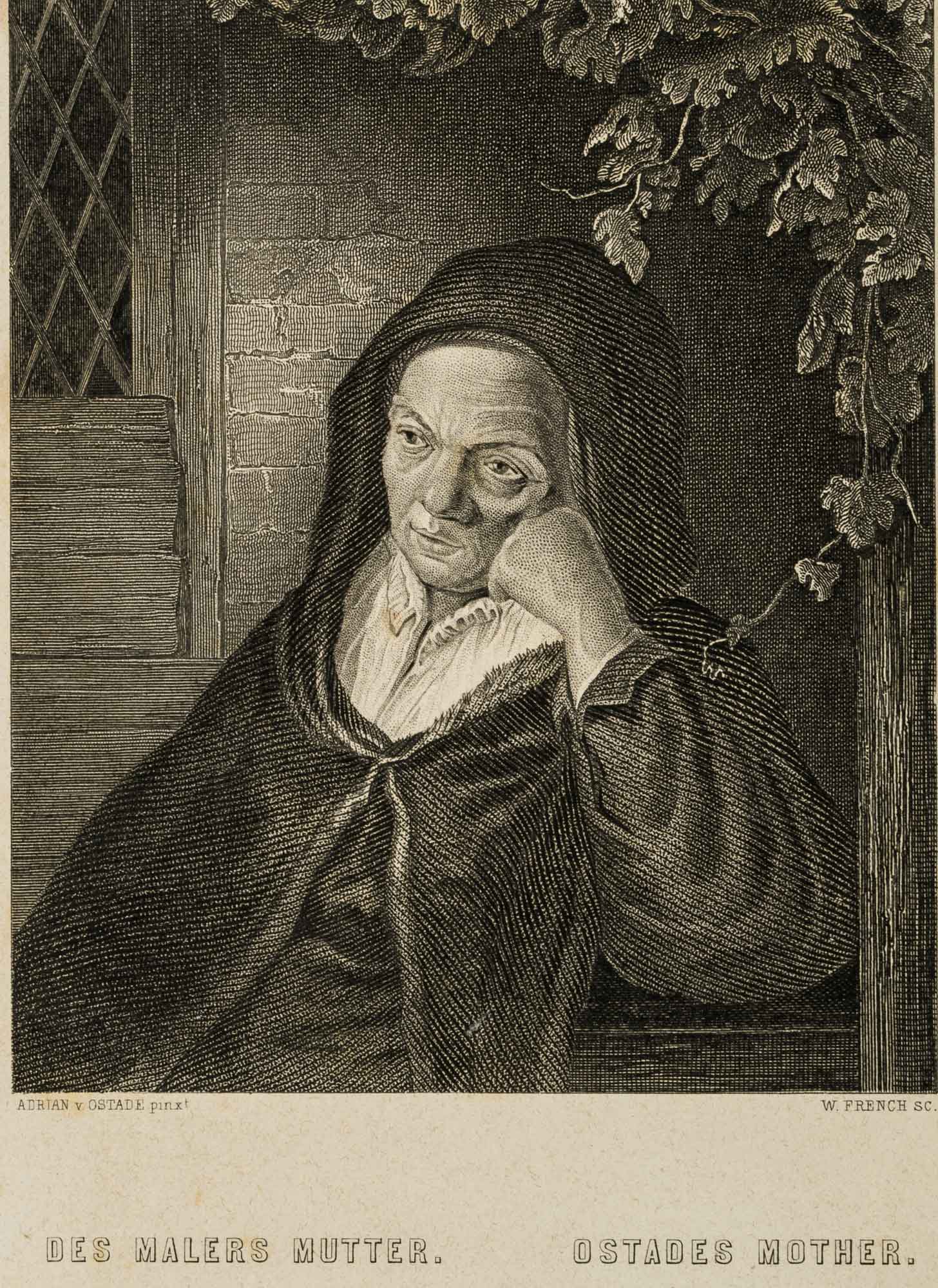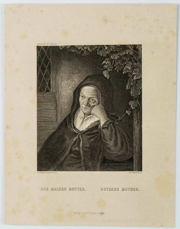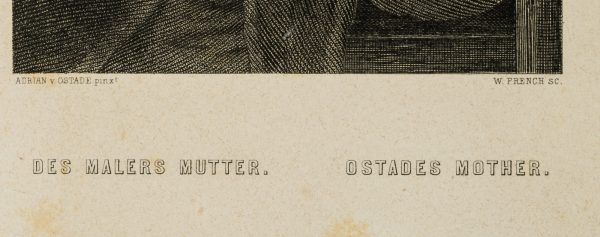 - Inscription: Signed “ADRIAN v. OSTADE pinxt” below the print on the left and “W. FRENCH sc.” on the right. Below the title of the picture: “DES MALERS MUTTER. OSTADE’S MOTHER.”