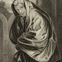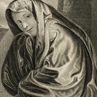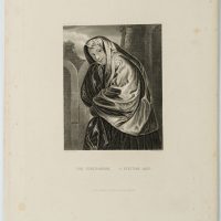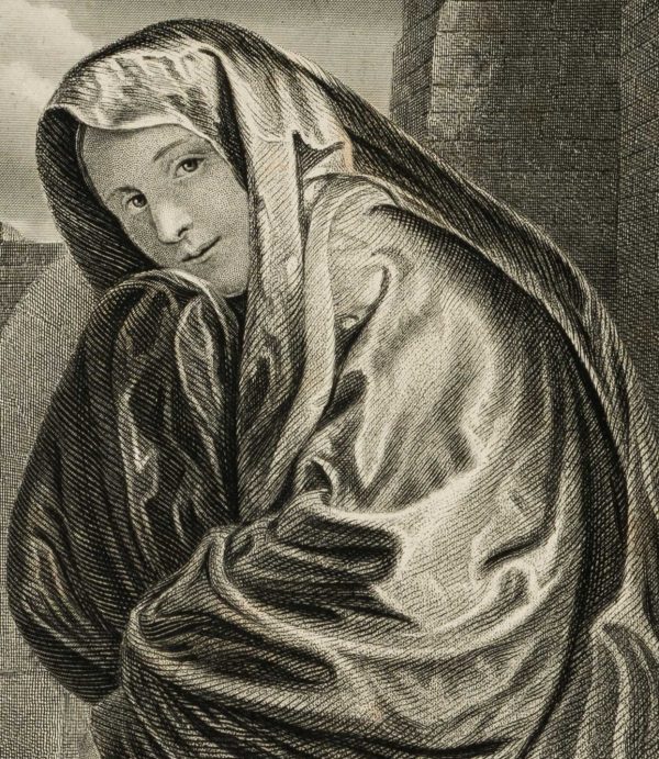 William French (1815 Sussex – 1898 East Grinstead) after Giovanni Girolamo Savoldo (1488 – 1548 ), Portrait of a Venetian woman in a wide robe with veil in front of ruins, 19th century, Steel engraving