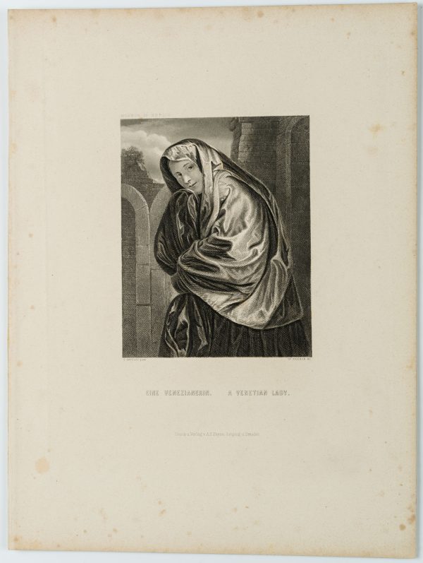 - Inscription: Signed on the lower left with “G. SAVOLDO pinx” and on the right with “W. FRENCH sc”. Below titled in English and German “EINE VENEZIANERIN. | A VENETIAN LADY.”. Inscribed above with: “MUSEUM IN BERLIN”.