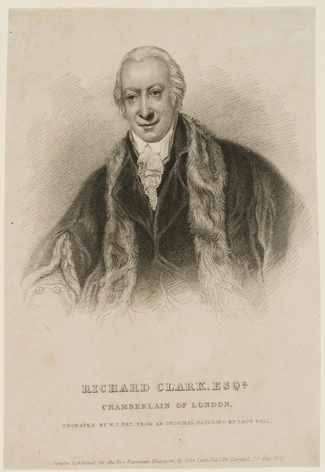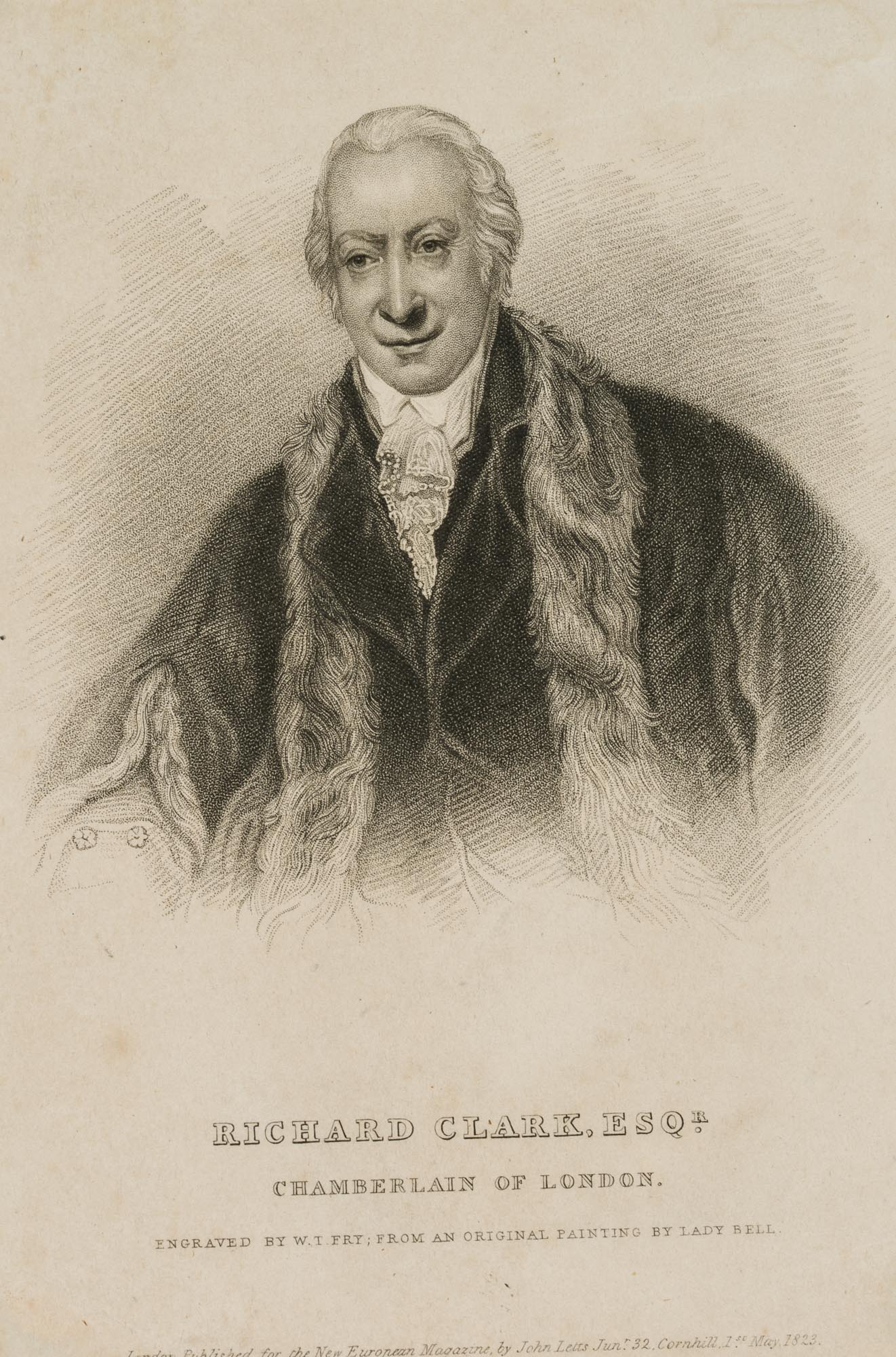William Thomas Fry (1789 London – 1843 ibid.) after Lady Bell: Maria Bell (1755 London – 1825 ibid.), Portrait des Richard Clark Esqr Chamberlain of London, 1823, Etching
