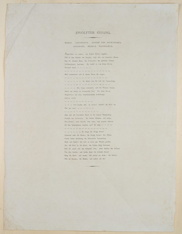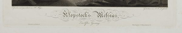 - Inscription: Signed on the left below the illustration with “Invented and drawn by H. Füger”, inscribed in the centre with: “Klopstock’s Messias, Zwölfter Gesang” and signed on the right with “Engraved by J. F. Leybold.”. The twelfth canto is enclosed as a text printed on Japanese paper. Please note our other offers from the series ‘Klopstock’s Messiah’.