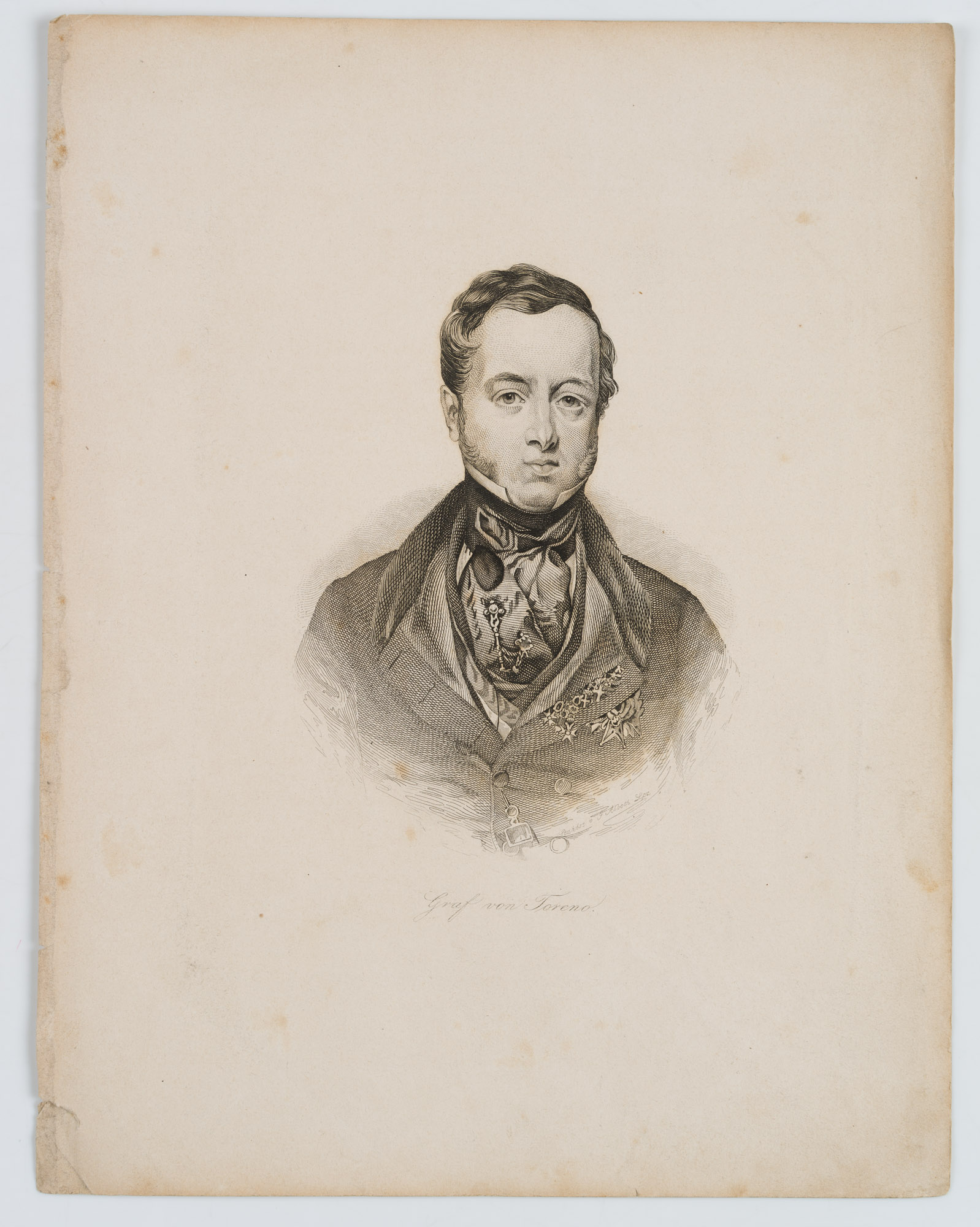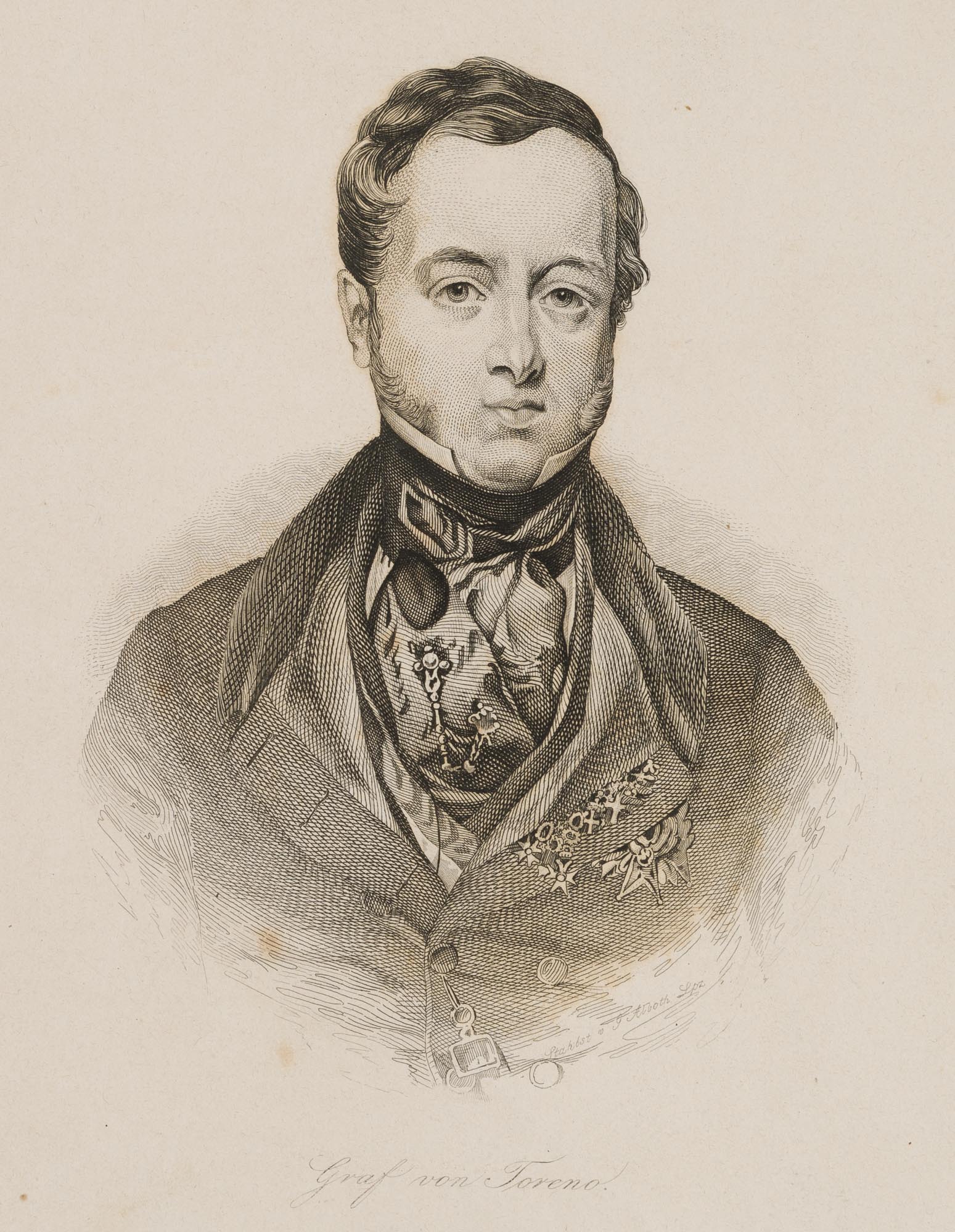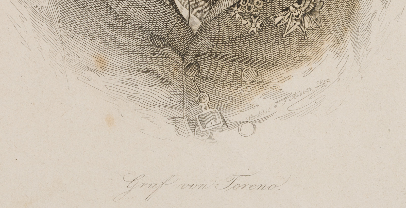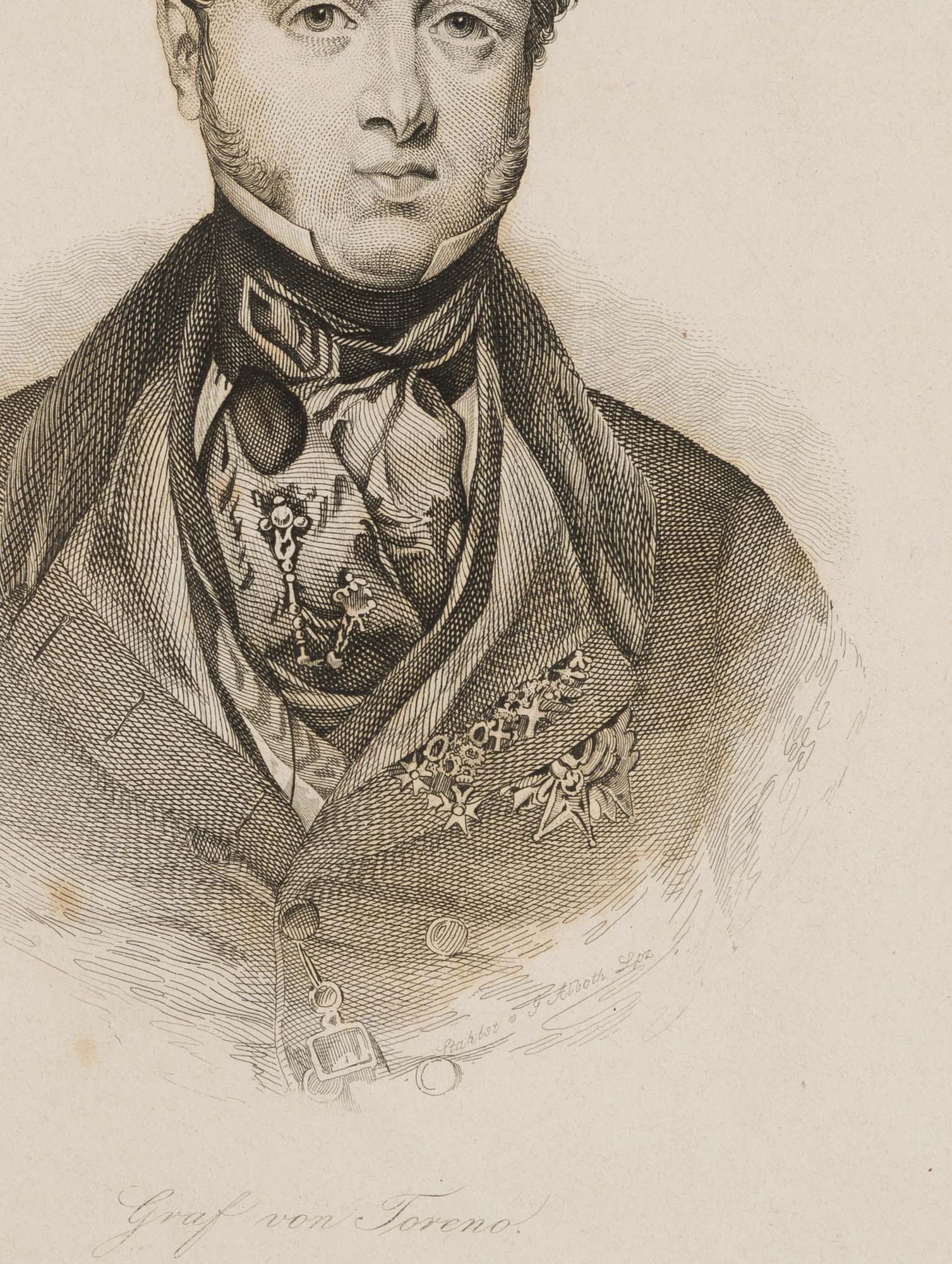 Gustav Robert Alboth (*1817 Leipzig), Bildnis des Grafen von Toreno. José María Queipo de Llano Ruiz de Saravia (1786 Oviedo – 1843 Paris), spanischer Historiker, Politiker und Finanzminister Spaniens, Bruststück mit Blick frontal auf den Betrachter gerichtet, 19. Jahrhundert, Stahlstich