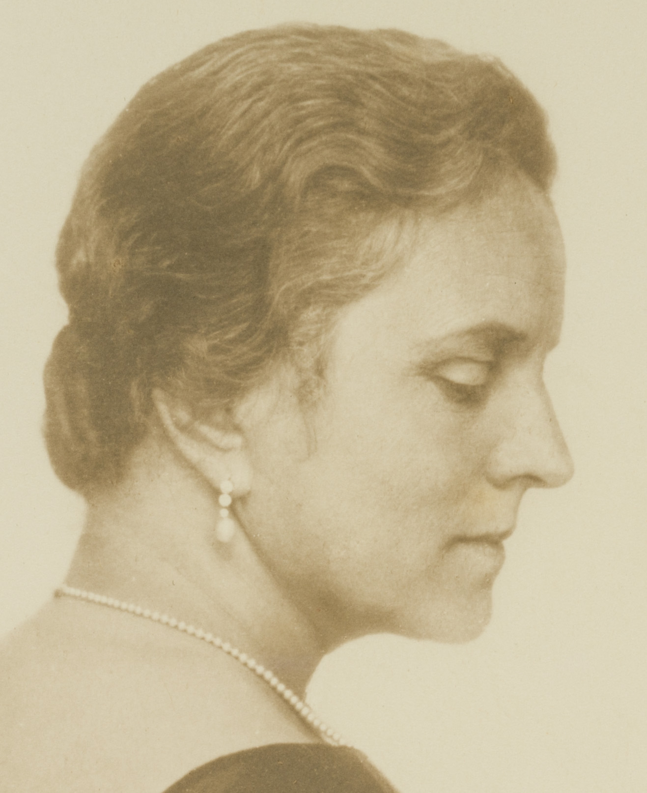 Brust im Profil mit abgewandtem Oberkörper. Die Dargestellte trägt ein dunkles Kleid sowie Perlenschmuck und hat die Augen nachdenklich niedergeschlagen. Minnie NAST zählt zu den großen deutschen Opernsängerinnen des frühen 20. Jahrhunderts. Nach ihrem musikalischen Studium am Badischen Konservatorium in Karlsruhe machte sie ihr gesangliches Debüt 1897 in Aachen. Sie begann eine erfolgreiche Karriere, die sie unter anderem auf die Bühnen in Kanada, den Vereinigten Staaten von Amerika, Russland, den Niederlanden und Großbritannien führte. Bis 1919 sang die Sopranistin regelmäßig in der Semperoper zu Dresden. Danach lehrte sie bis 1945 Gesang in Dresden. Minnie NAST ist für ihre munteren und leichten Verkörperungen von Soubrettenrollen, vor allem in Mozart-Opern, bekannt. Eine herausragende Leistung erwies sie am 26. Januar 1911 als sie bei der Uraufführung von Richard Strauss’ Der Rosenkavalier die Rolle der Sophie sang. Durch erhaltene Tonaufnahmen kann man noch heute ihre klare und bezaubernde Stimme erleben. Die Fotografie stammt aus dem Studio der berühmten Dresdner Fotografin Grete BACK (eigtl. Margarete Bertha Back), die nach einer Lehre bei Hugo ERFURTH in Dresden auch im europäischen Ausland tätig war und schließlich 1909 in Dresden ein eigenes Studio eröffnete. Der Schwerpunkt ihrer fotografischen Arbeit liegt in der Porträt- und Theaterfotografie. - Schlagworte: Porträt, Deutschland, Art Nouveau, 1925-1949