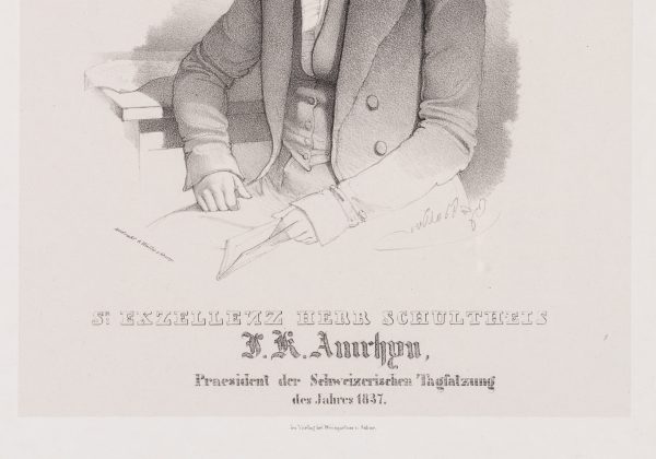 - Inscription: Lower right signed in the printing plate: “G. Balder”. At the lower part inscribed in the printing plate: “gedruckt b. Wallis & Comp. | Sr: Exzellenz Herr Schultheis J. K. Amrhyn, Praesident der Schweizerischen Tagsatzung des Jahres 1837”.