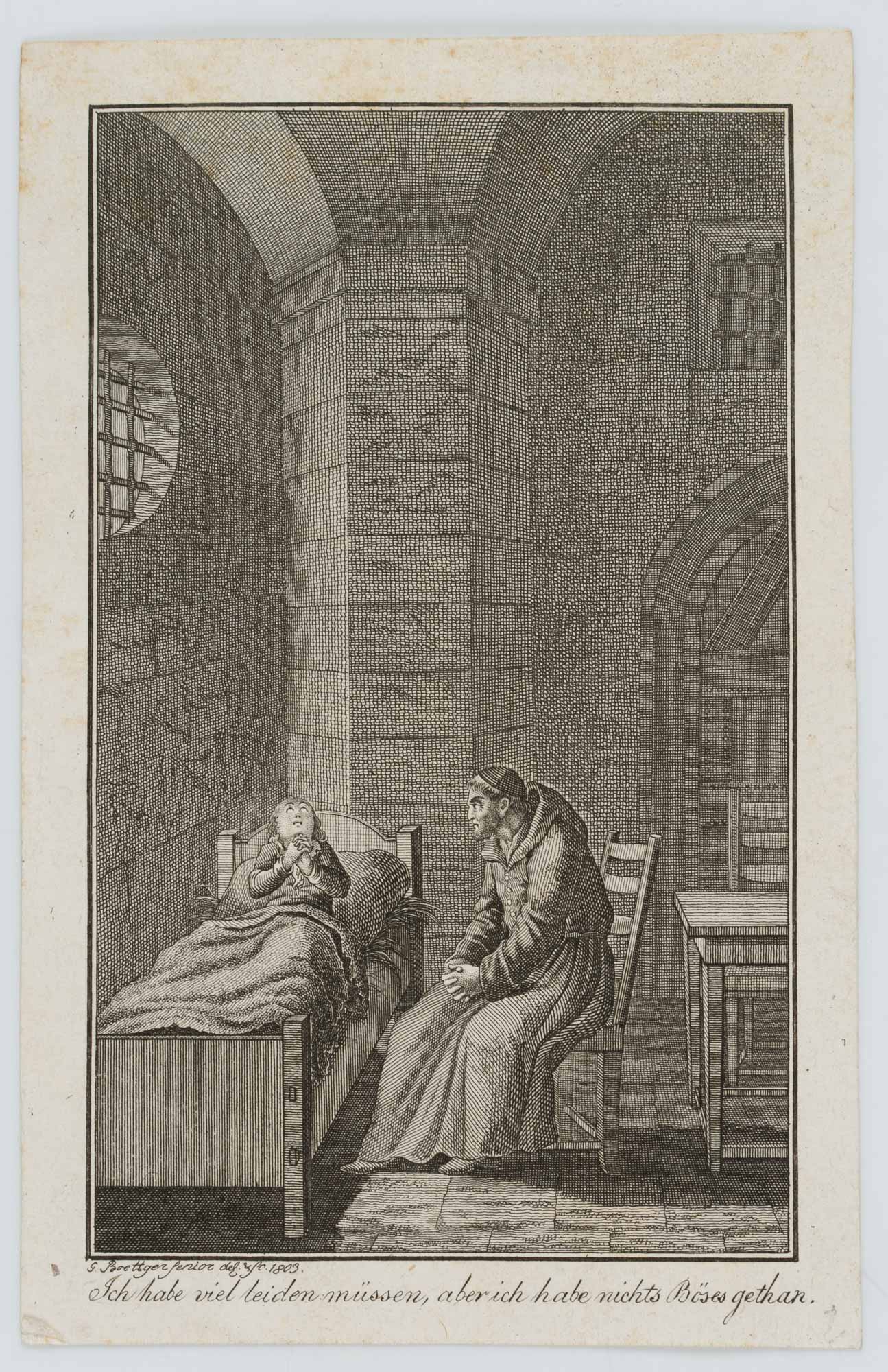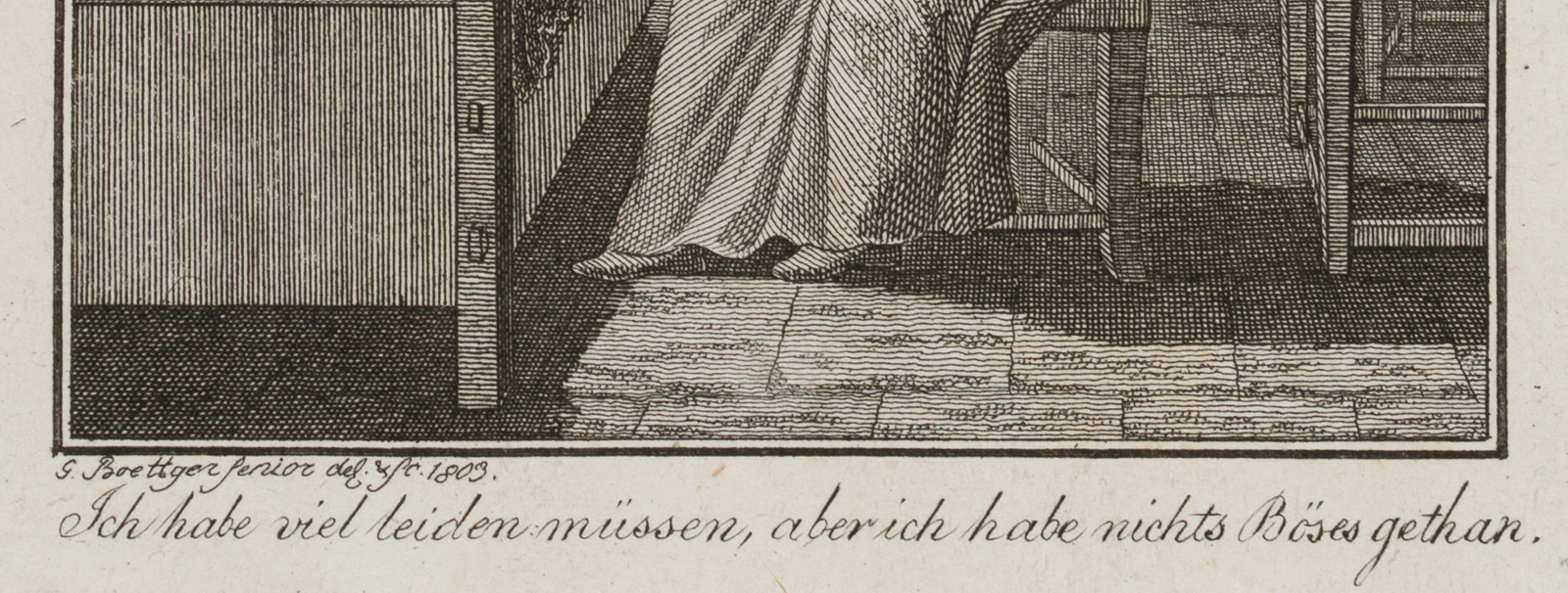 Gottlieb Boettger d. Ä. (*um 1796 ), “Ich habe viel leiden müssen, aber ich habe nichts Böses gethan”, Buchillustration, 1809, Kupferstich