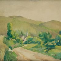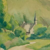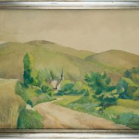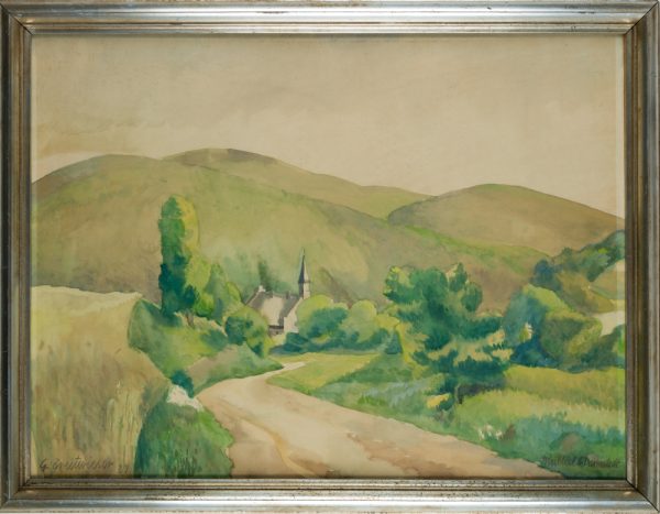 • Description: Beautiful landscape painting with a lonely chapel in front of the rolling hills of the front Odenwald. Along the roadside, bushes and small trees are depicted in bright shades of green. The Darmstadt artist created a veduta of his home landscape with great dedication.