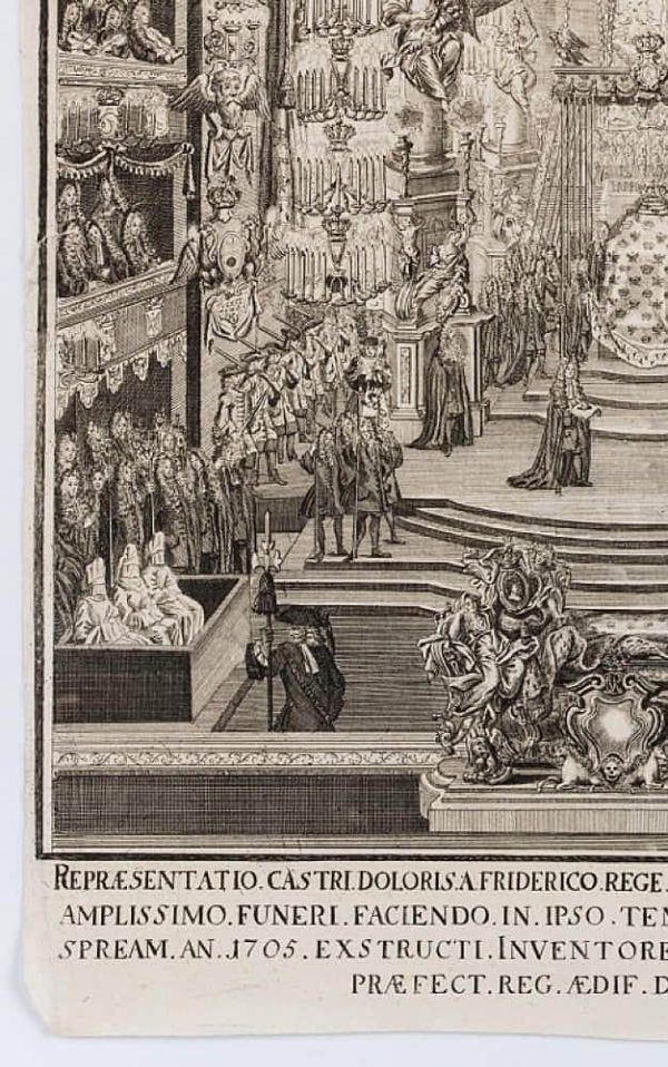 - Inscription: signed and inscribed lower right in the printing plate: “Repraesentatio Castri Doloris A Friderico Rege Boruss. D. Reginae Coniugis Sophiae Carolinae[?[…]”
