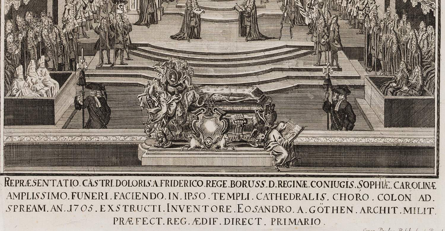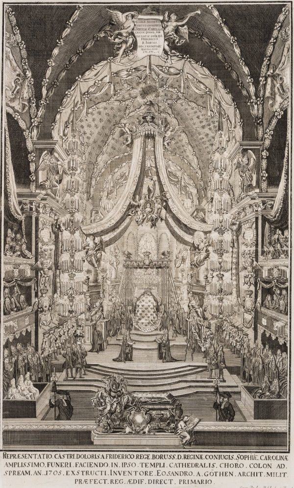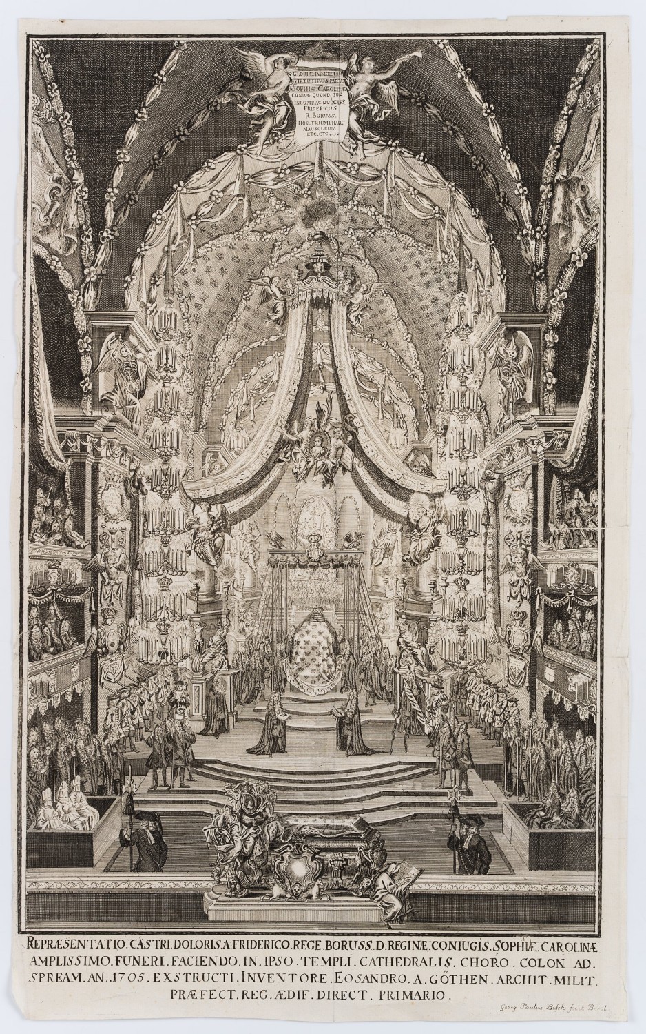 - Description: Large-format depiction of the funeral and memorial service for Sophie Charlotte of Hanover in Berlin Cathedral.
