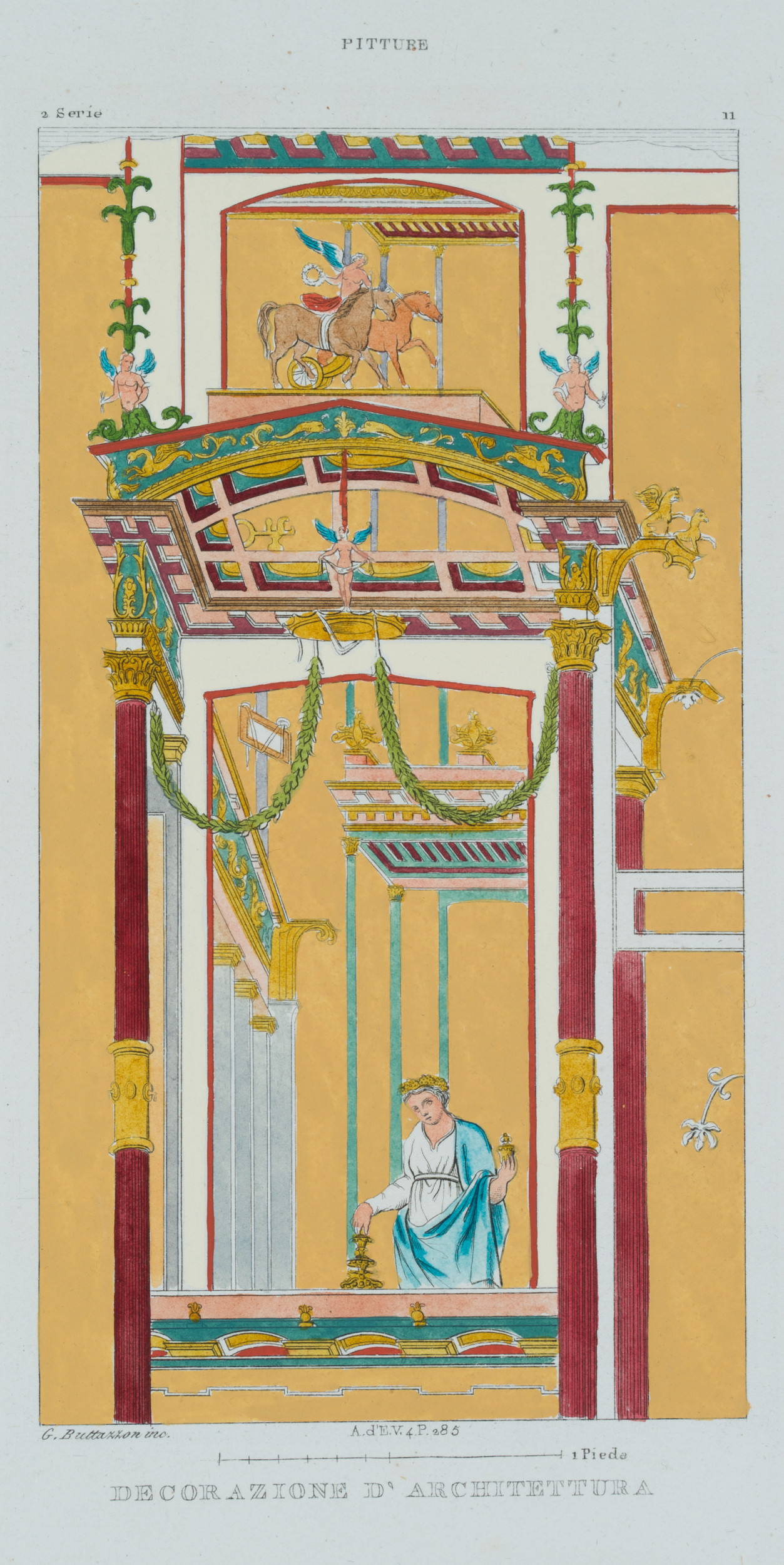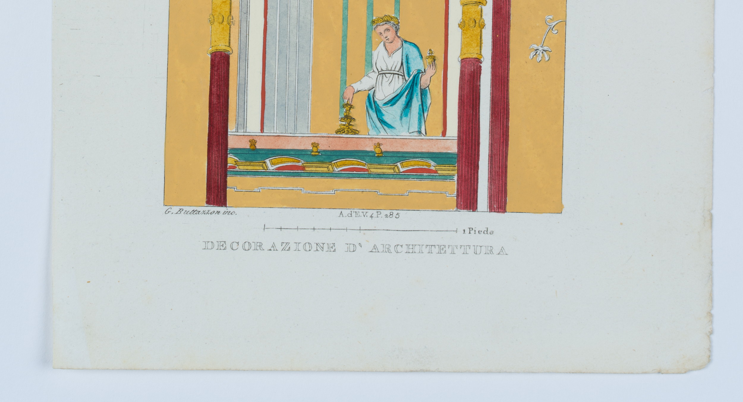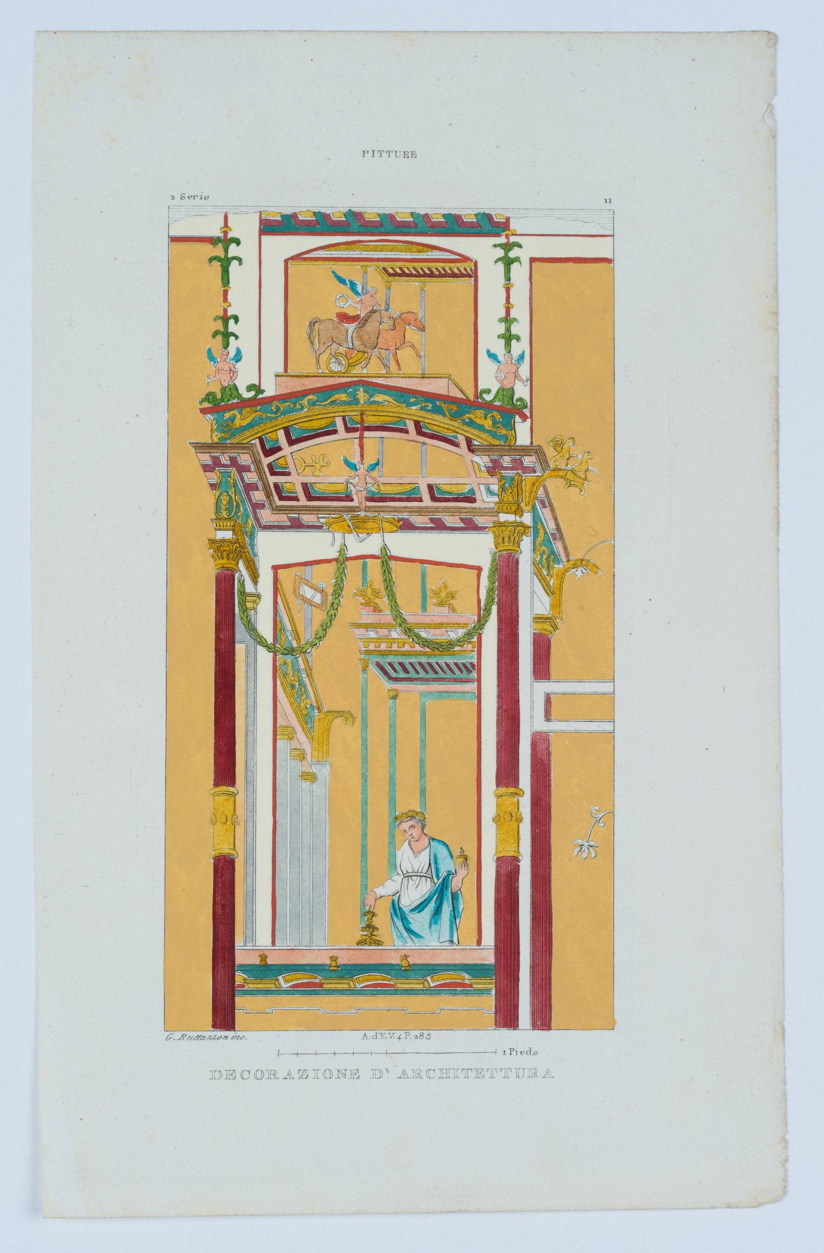- Inscription: lower left signed in the printing plate: “G. Buttazzon inc.”. At the center inscribed in the printing plate: “Pitture | Decorazione D’Architettura”. Upper middle numbered in the printing plate: “2 Serie | 11 “.