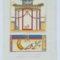 - Beschreibung: Unter der Architekturansicht ist eine kleinere Graphik eines Arrangements aus Instrumenten und grünem Zweig zu sehen. Stiche nach den Fresken aus den Grabungsstätten um Neapel, Herculaneum und Pompeji.