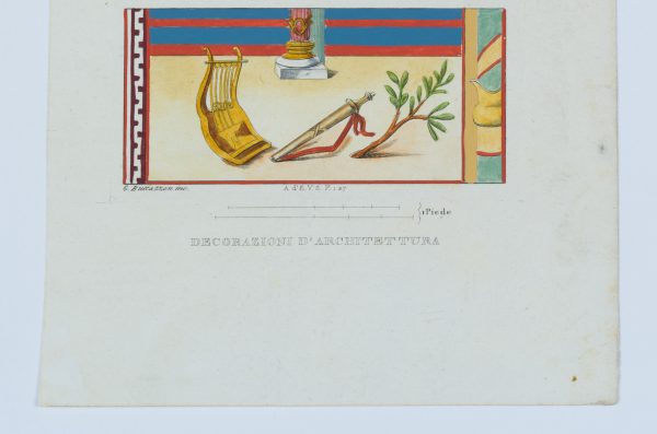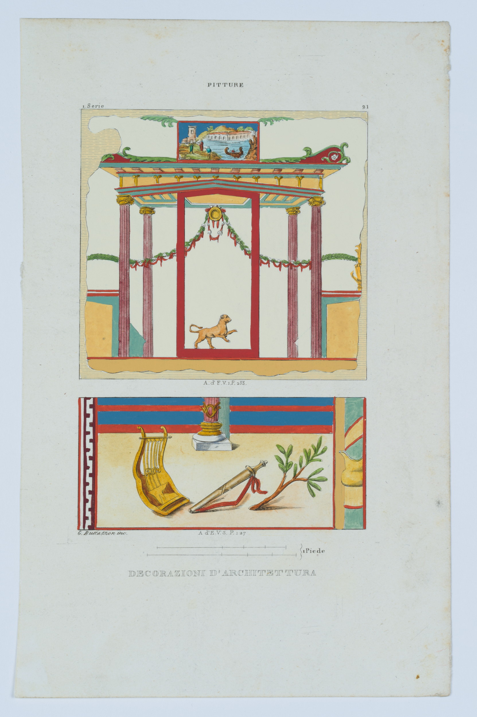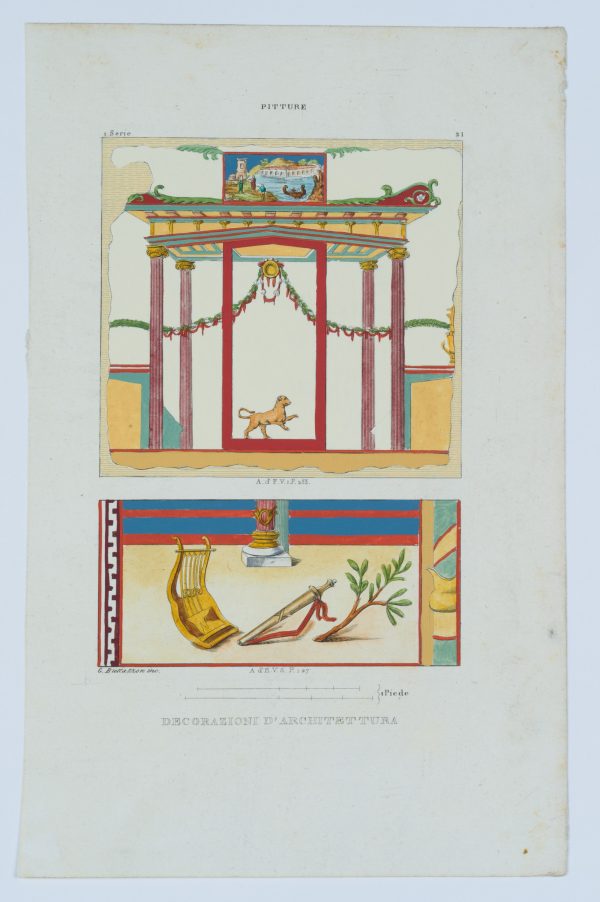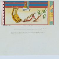 - Description: Below the architectural view is a smaller graphic of an arrangement of instruments and green branch. Engravings after the frescoes from the excavation sites around Naples, Herculaneum and Pompeii.