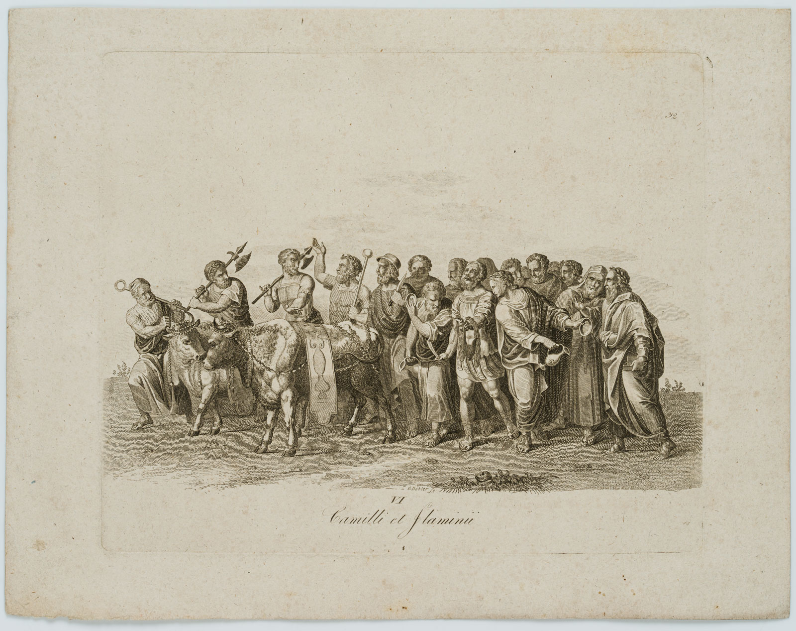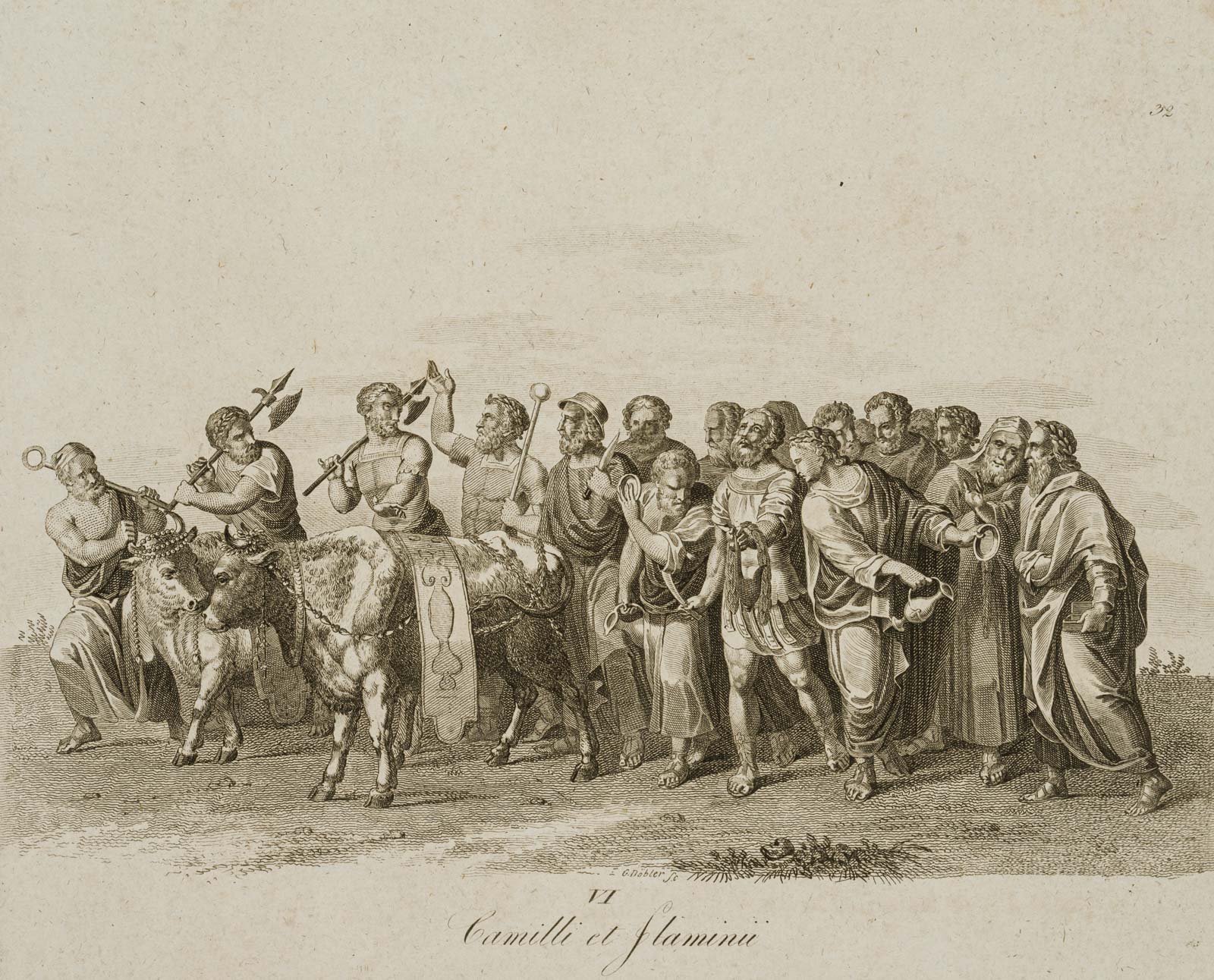 - Beschreibung: Knaben mit goldenen und silbernen Opfergefäßen. Mittig unterhalb der Darstellung in der Druckplatte signiert: “G. Döbler sc.”, darunter typographisch betitelt “Camilli et Flaminii”; Mitterbacher Prag 1819; oben rechts nummeriert “32”.