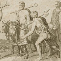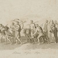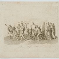 - Description: Procession led by two horn players and two trumpeters with two bulls, which are to serve as sacrifices. Signed in the centre below the depiction in the printing plate: “G. Döbler”, below typographically titled “V. Fubicines. Hostiae. Popae”; Mitterbacher Prague 1819; numbered “30” in the upper right corner.