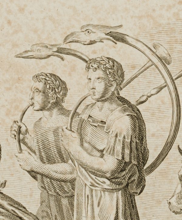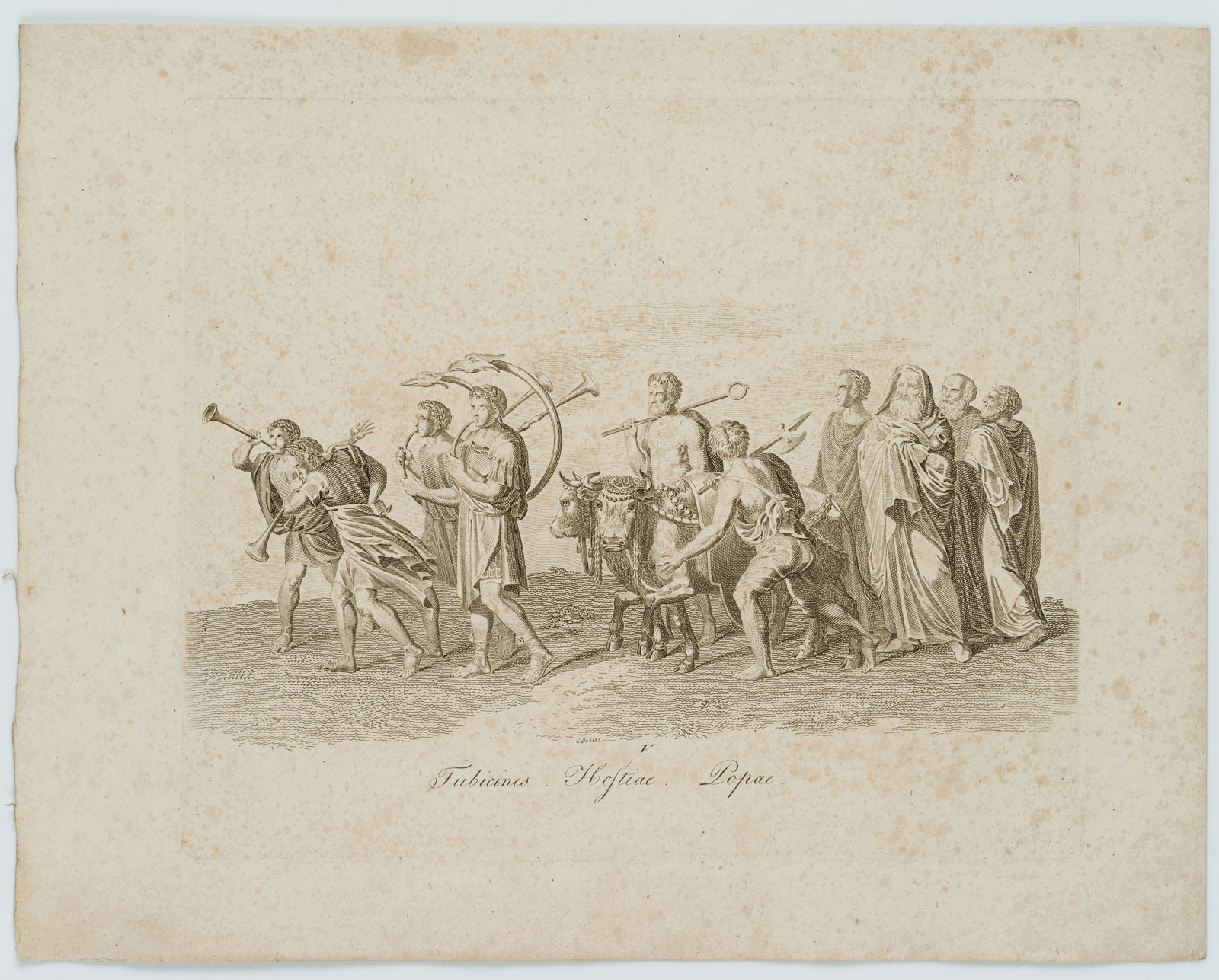 Georg Döbler (1788 Prague – 1845 Prag), Horn player, trumpeter and bull sacrifice, “Fubicines Hostiae Popae”, 1819, Copper engraving
