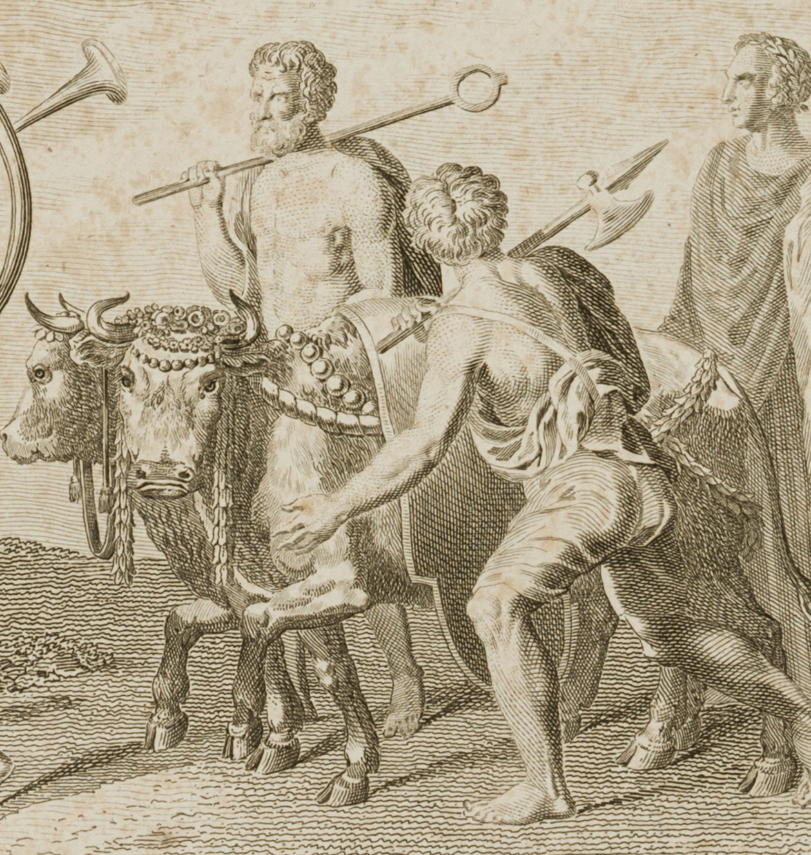 Georg Döbler (1788 Prag – 1845 ebd.), Hornist, Trompeter und Stieropfer, “Fubicines. Hostiae. Popae”, 1819, Kupferstich