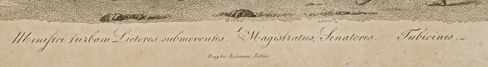 - Bezeichnung: Unterhalb der Darstellung signiert: “G. Döbler sc.”, darunter betitelt: “Ministri turbam Lictores submoventes. Magistratus Senatores. Fubicines”; darunter bezeichnet “Prag bei Bohmanns Erben”. Oben rechts nummeriert “24”.