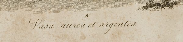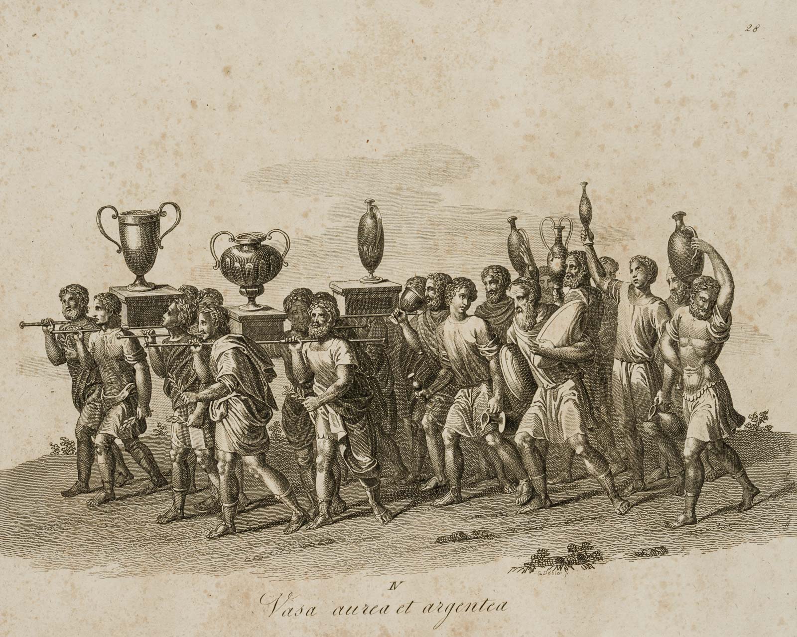- Bezeichnung: Rechts unterhalb der Darstellung in der Druckplatte signiert: “G. Döbler sc.”, darunter typographisch betitelt “IV. Vasa aurea et argentea”; Mitterbacher Prag 1819; oben rechts nummeriert “28”.