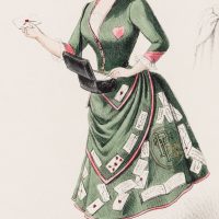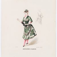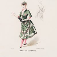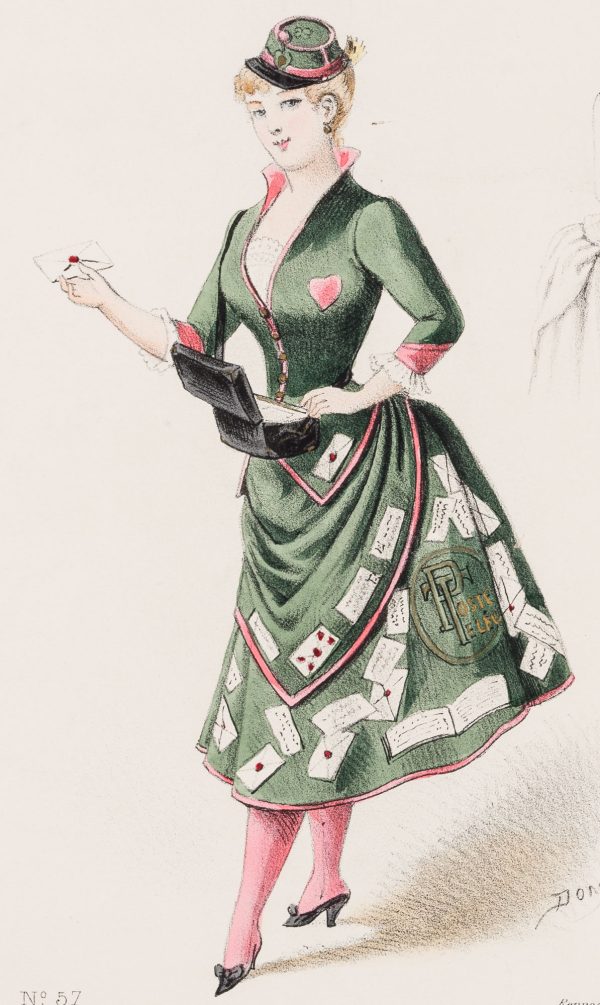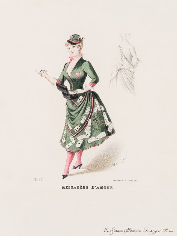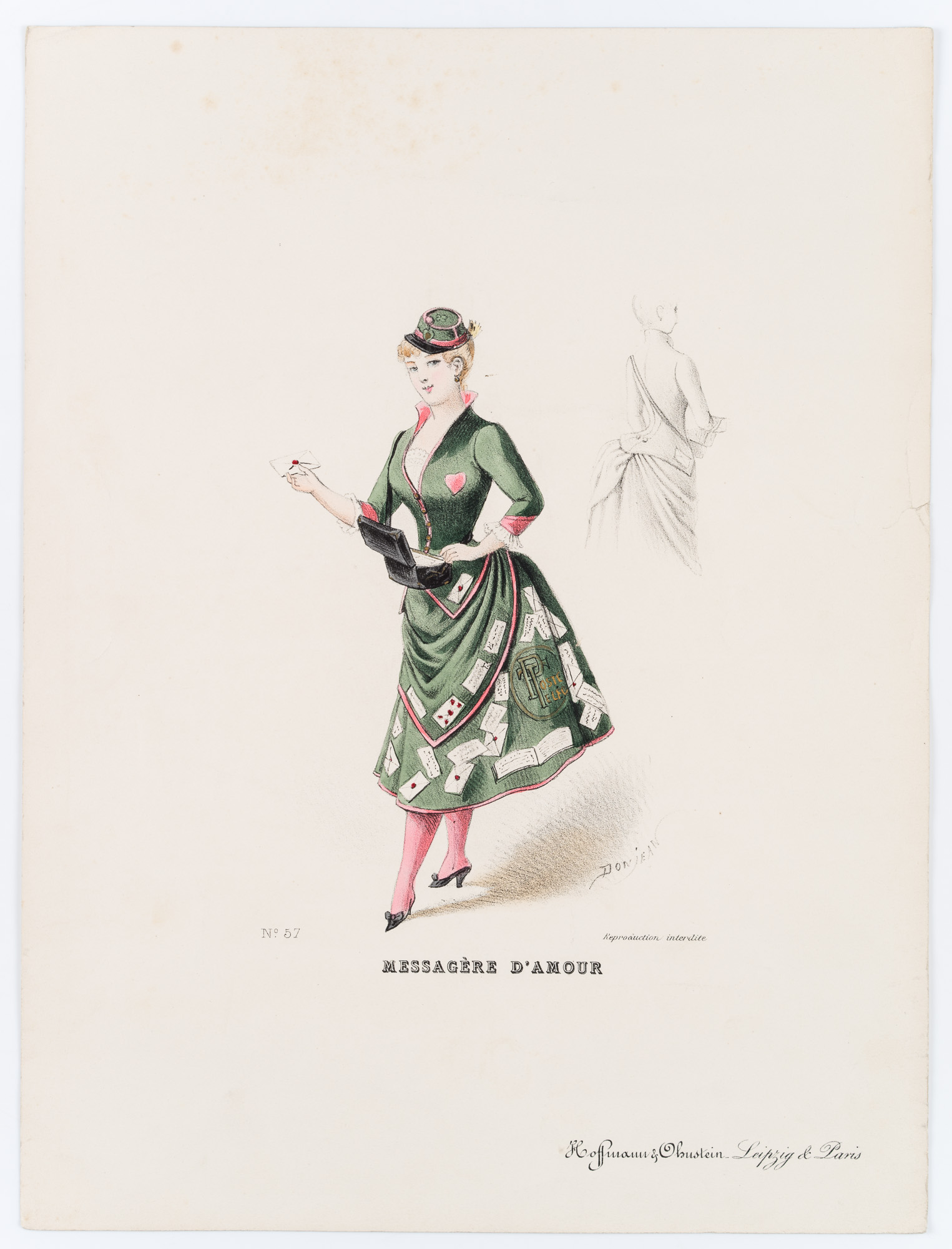 Gustave Donjean (um 1848 – 1893 ), Modeentwurf, Dame als Ganzkörper in einem Kostüm für Liebesbriefzustellerinnen, in zwei Abbildungen, 19. Jahrhundert, Lithographie