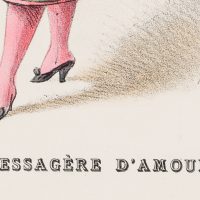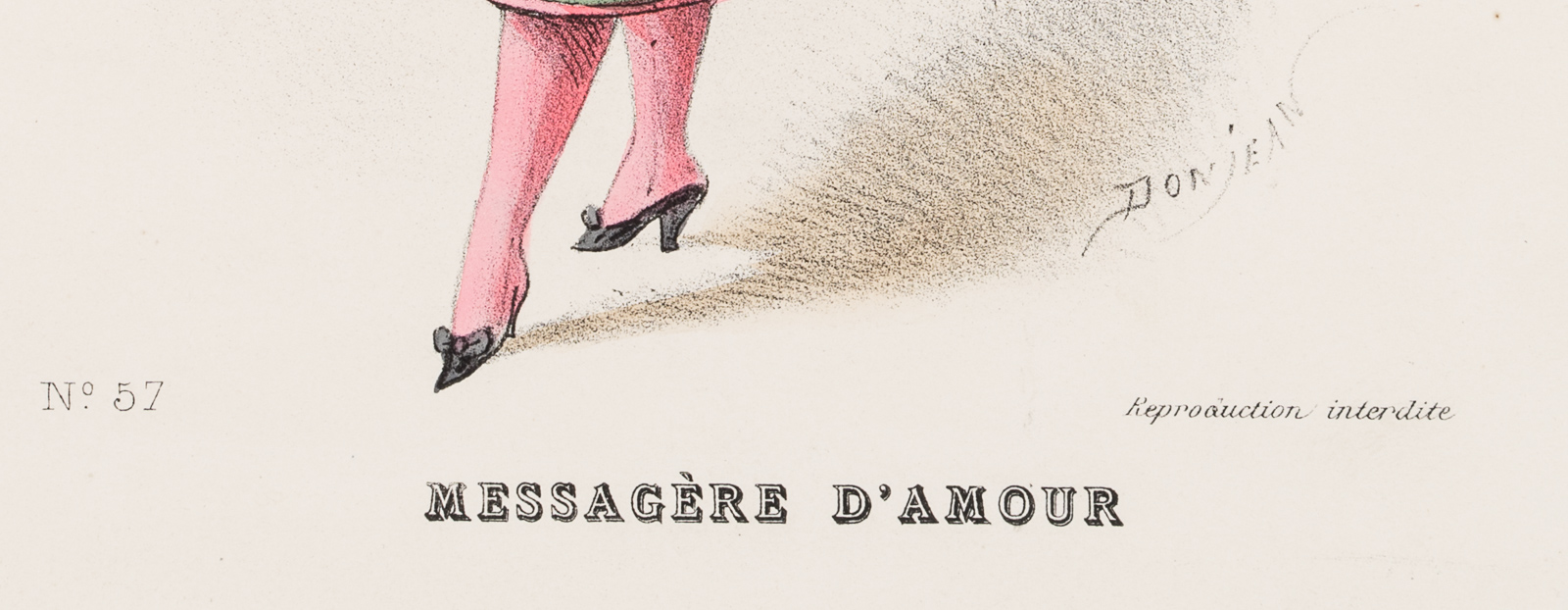 - Inscription: Signed „DONJEAN“ below the image on the right and numbered „N.57“ on the left, titled „MESSAGÈRE D’AMOUR“ below.