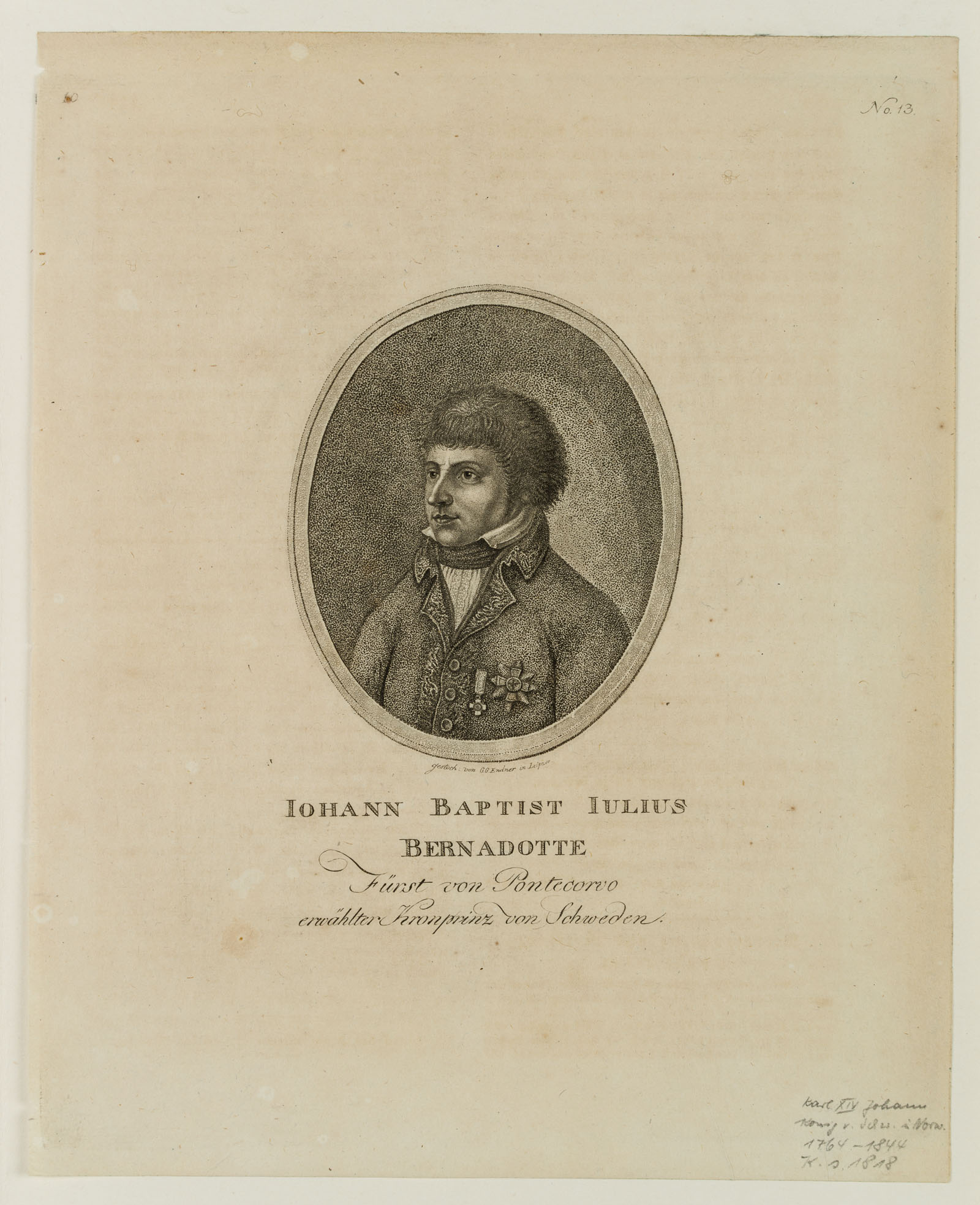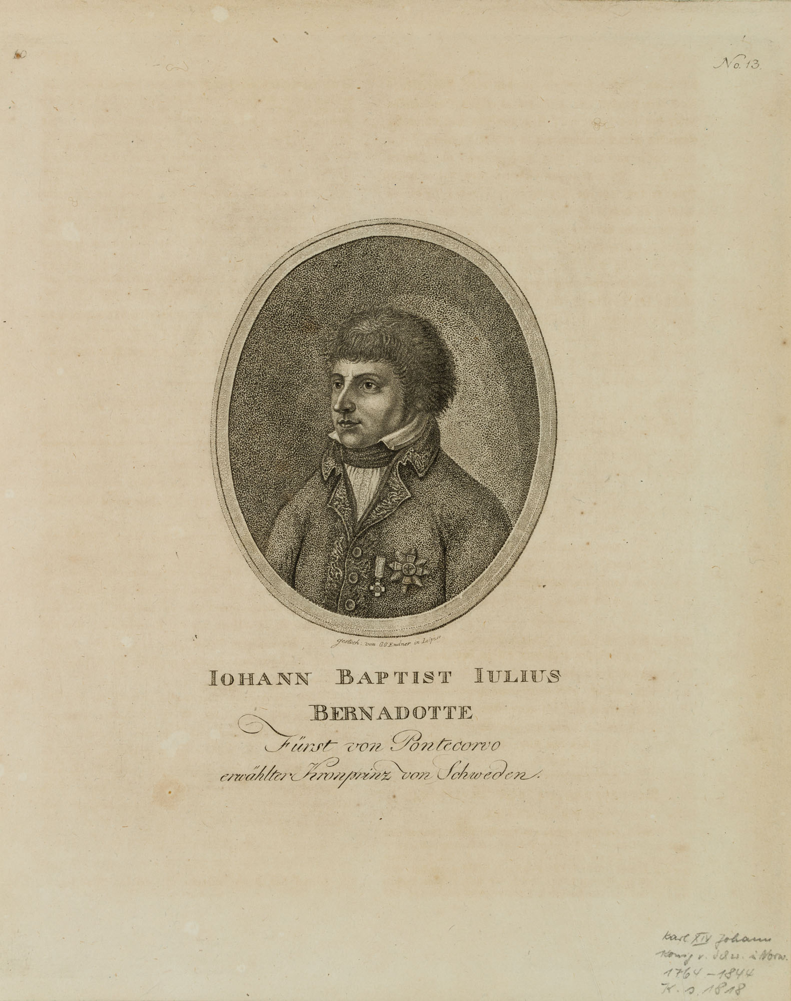 - Inscription: Titled and inscribed below the image: “engraved by G.G. Ender in Leipzig” and “Prince of Pontecorvo / Crown Prince of Sweden”. Lower right corner of the sheet with the sitter’s life data, in lead. Numbered at the top: “10 / No. 13”.