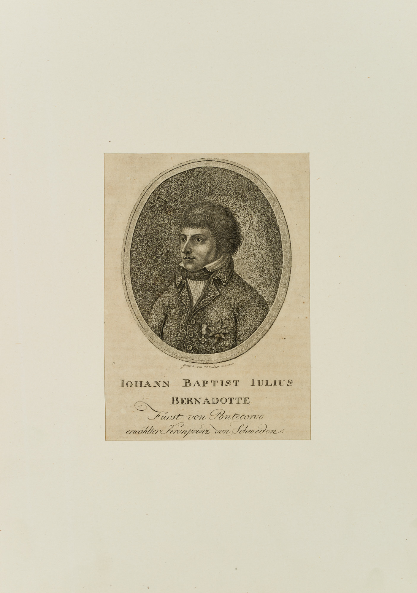 - Bezeichnung: Unterhalb der Darstellung betitelt und bezeichnet: “gestoch. von G.G.Ender in Leipzig” und “Fürst von Pontecorvo / erwählter Kronprinz von Schweden”. Unten rechts in der Blattecke mit den Lebensdaten des Dargestellten, in Blei. Oben nummeriert: “10 / No. 13”.