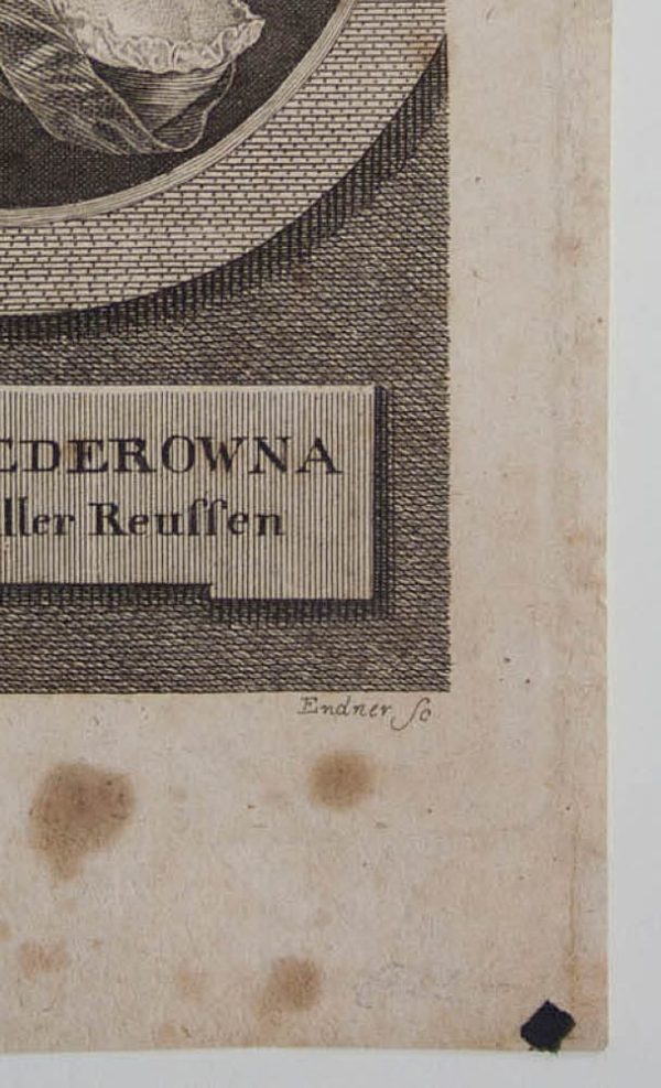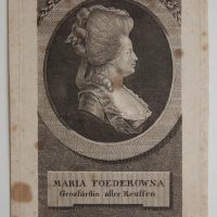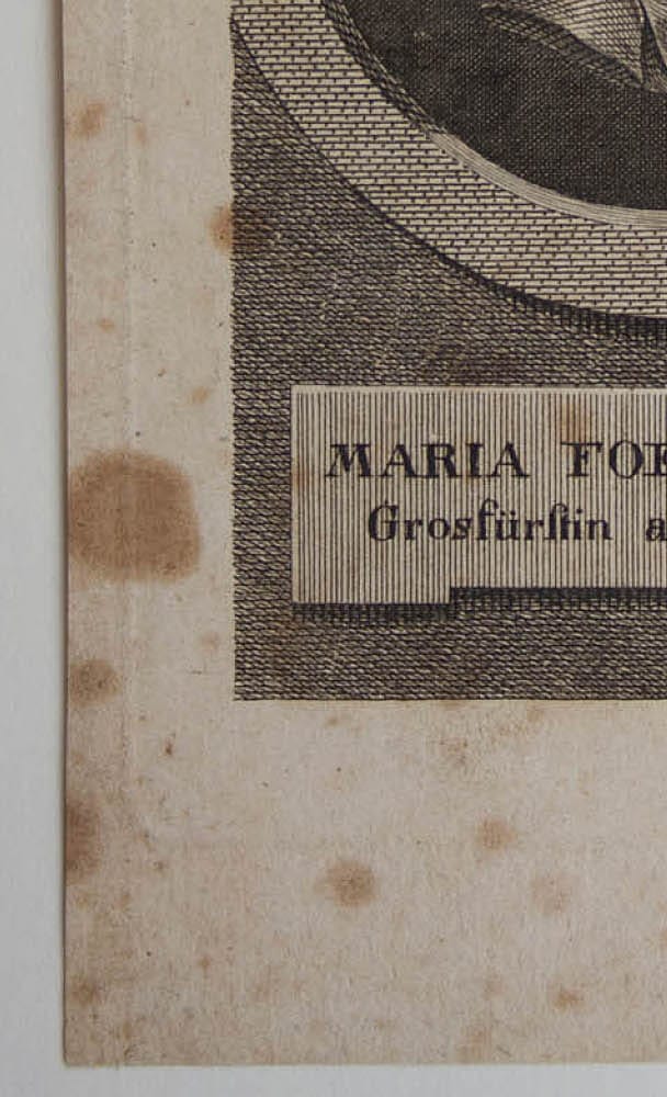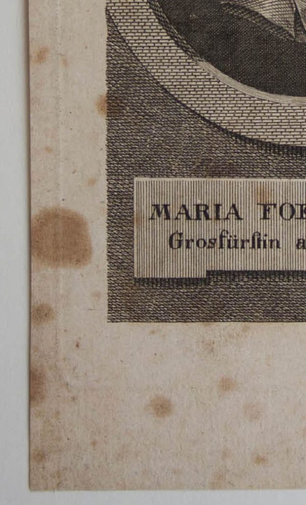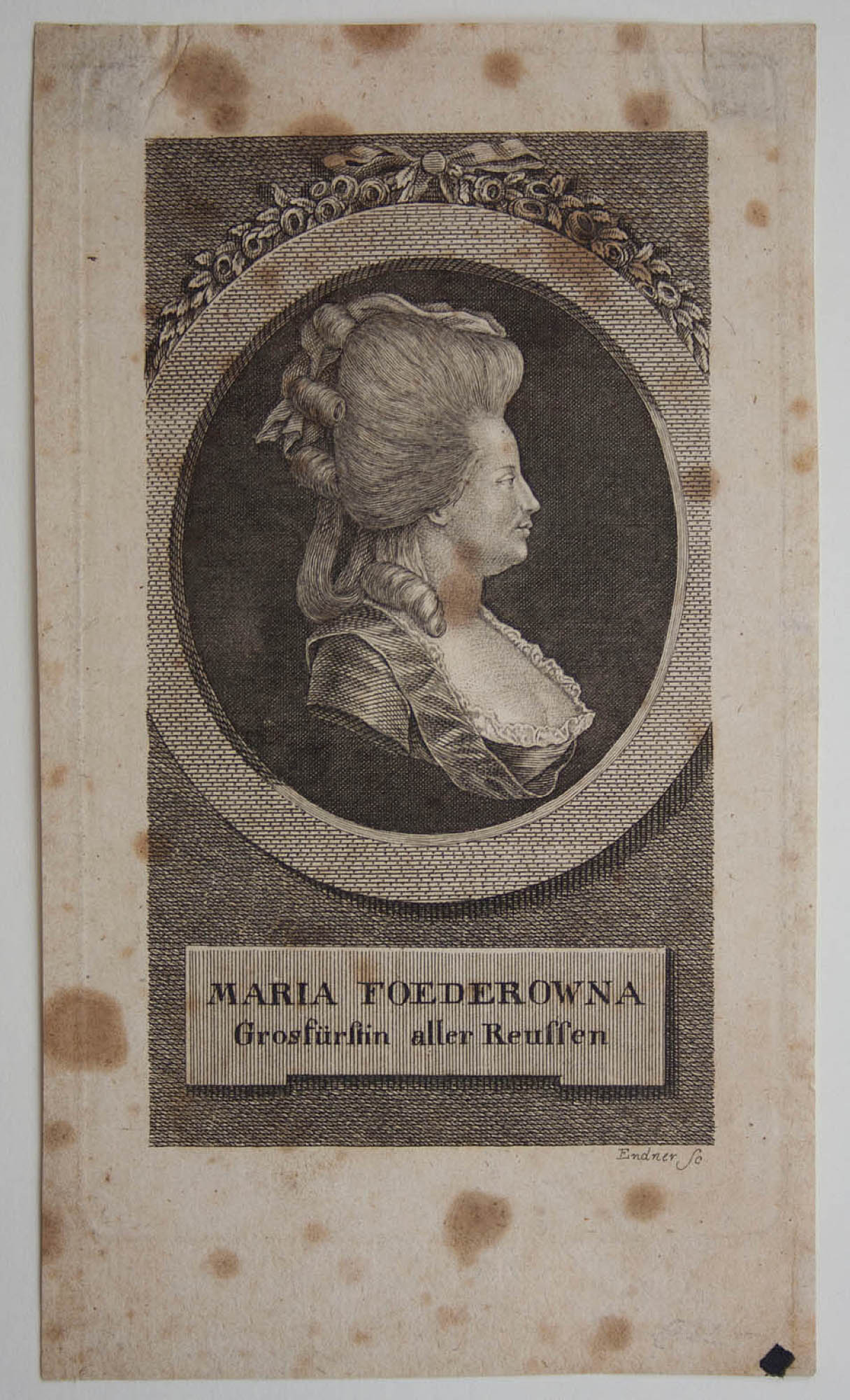 - Description: Maria Foederowna in profile (in oval). Inscription plate: MARIA FOEDEROWNA Grand Duchess of all the Russias. Endner sc. Etching on laid paper in small passepartout. Plate size: 14,2 x 8,4 cm. Paper size: 16,2 x 9,3 cm. Passepartout: 23,9 x 18,5 cm. The sheet shows age spots. . . English Version: . Maria Foederowna in profile (in oval). Tablet: MARIA FOEDEROWNA Grand Duchess of all Reussians. Endner sc. Etching on handmade paper in small passepartout. Slab Size: 14. 2 x 8. 4 cm. Paper Size: 16. 2 x 9. 3 cm. Mount: 23. 9 x 18. 5 cm. The Sheet: has age spots.
