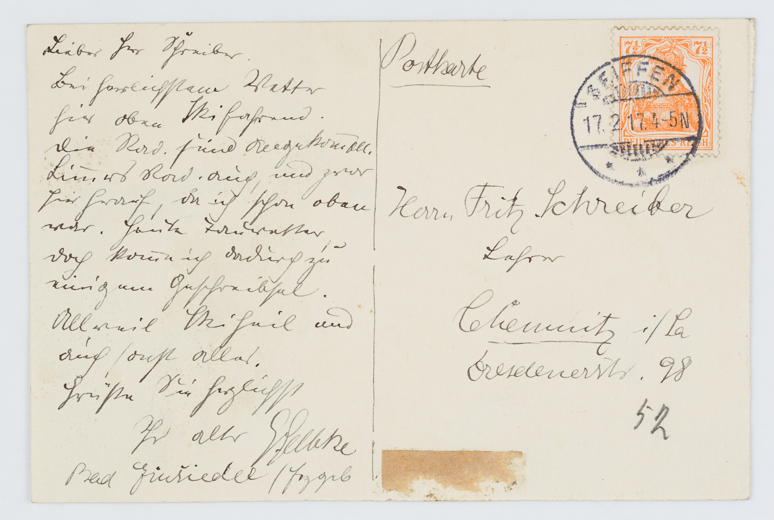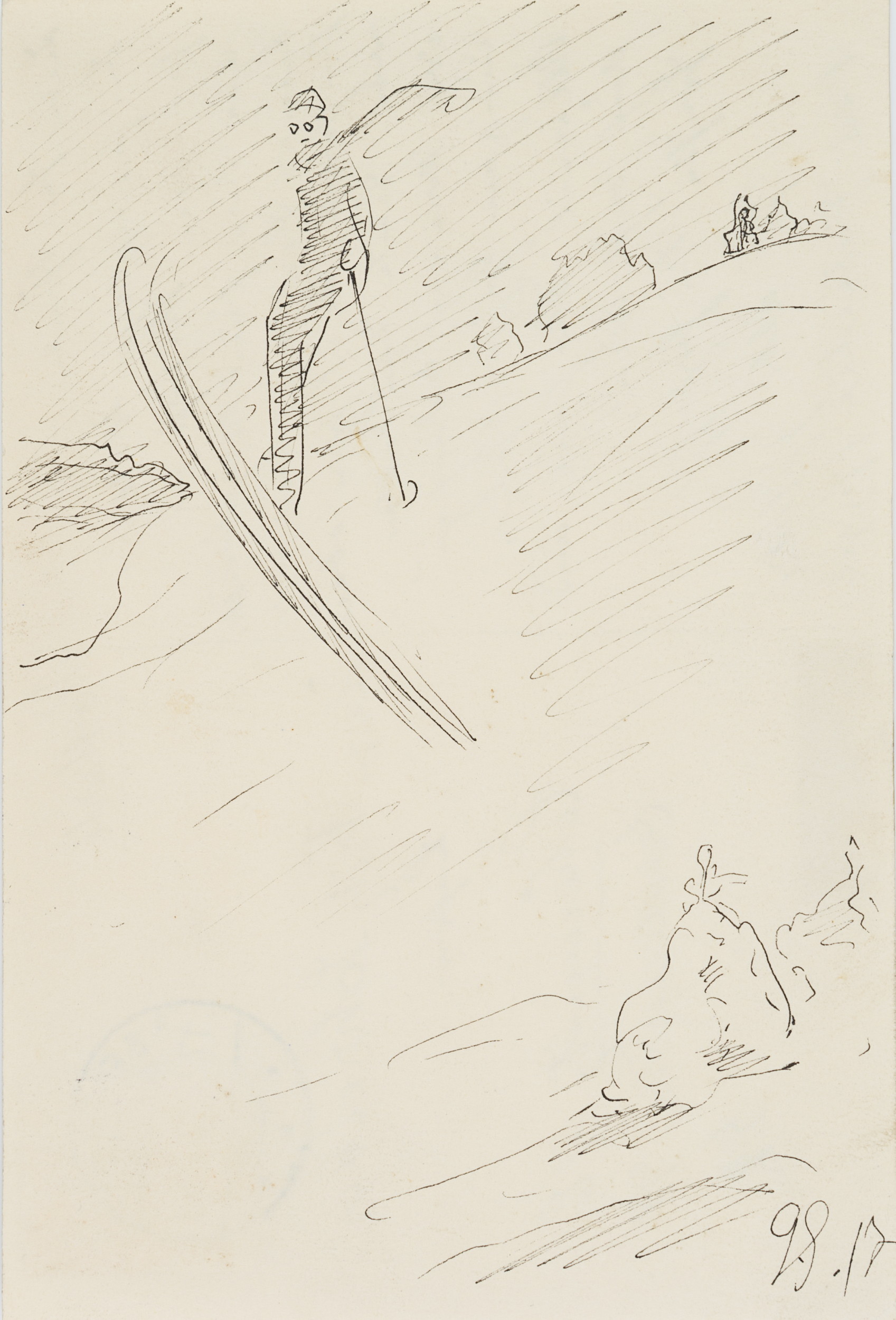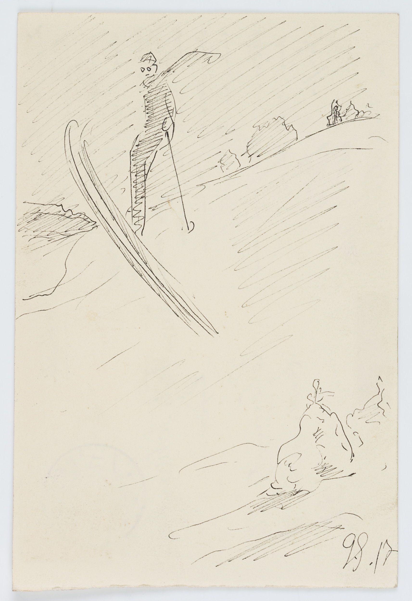 Georg Hermann Gelbke (1882 Rochlitz – 1947 Dresden), Postcard with skier to F Schreiber, 1917, Pen drawing