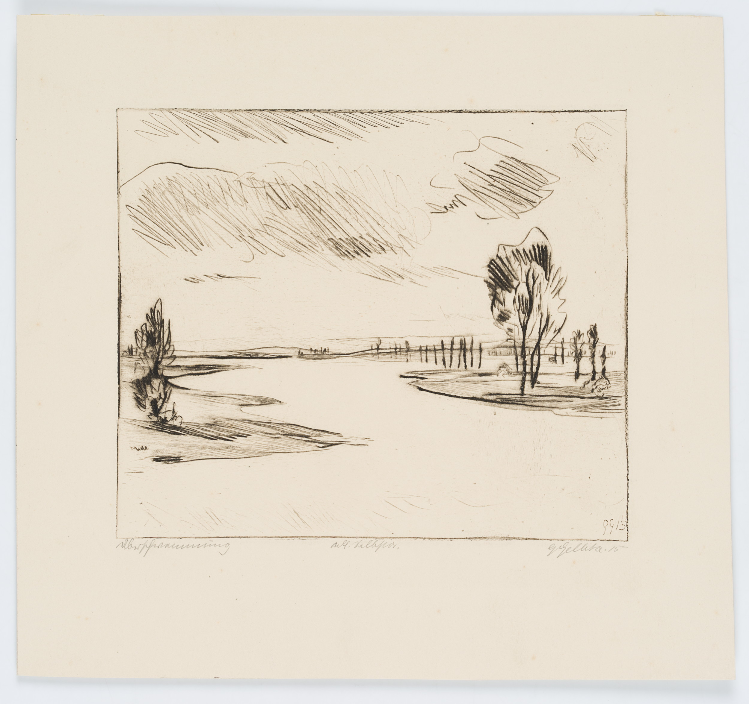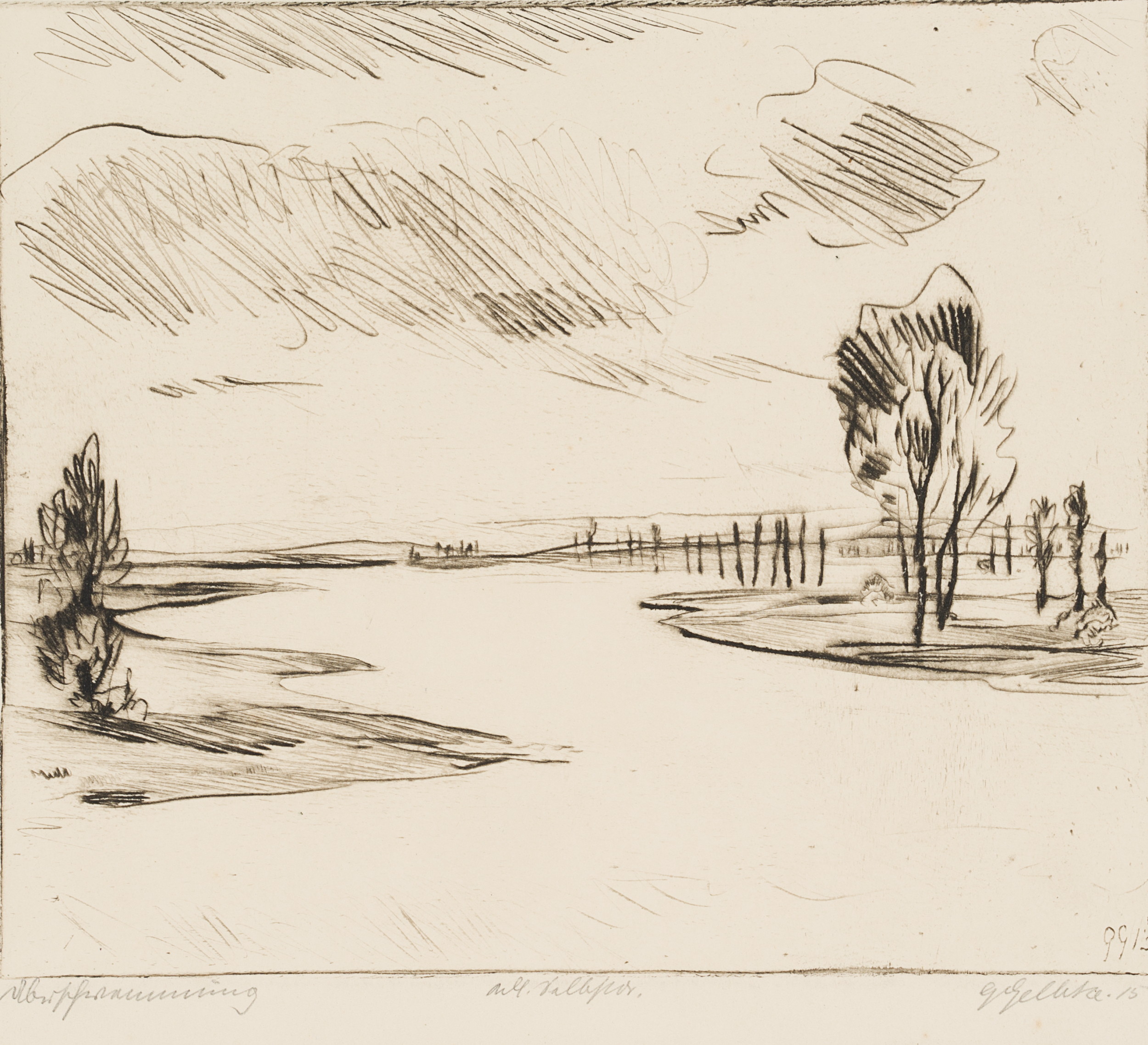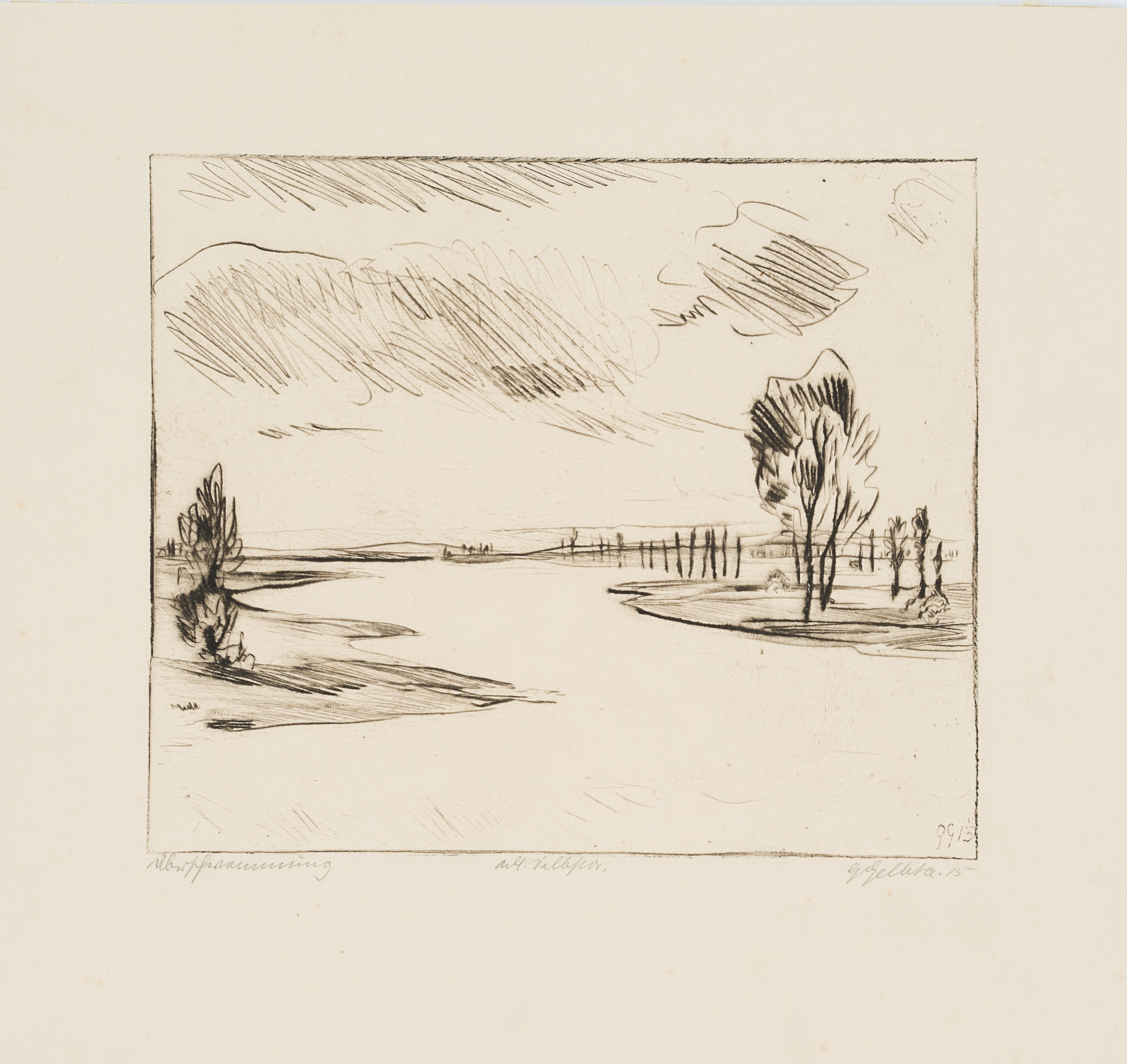 Georg Hermann Gelbke (1882 Rochlitz – 1947 Dresden), Überschwemmte Auenlandschaft, 1915, Radierung