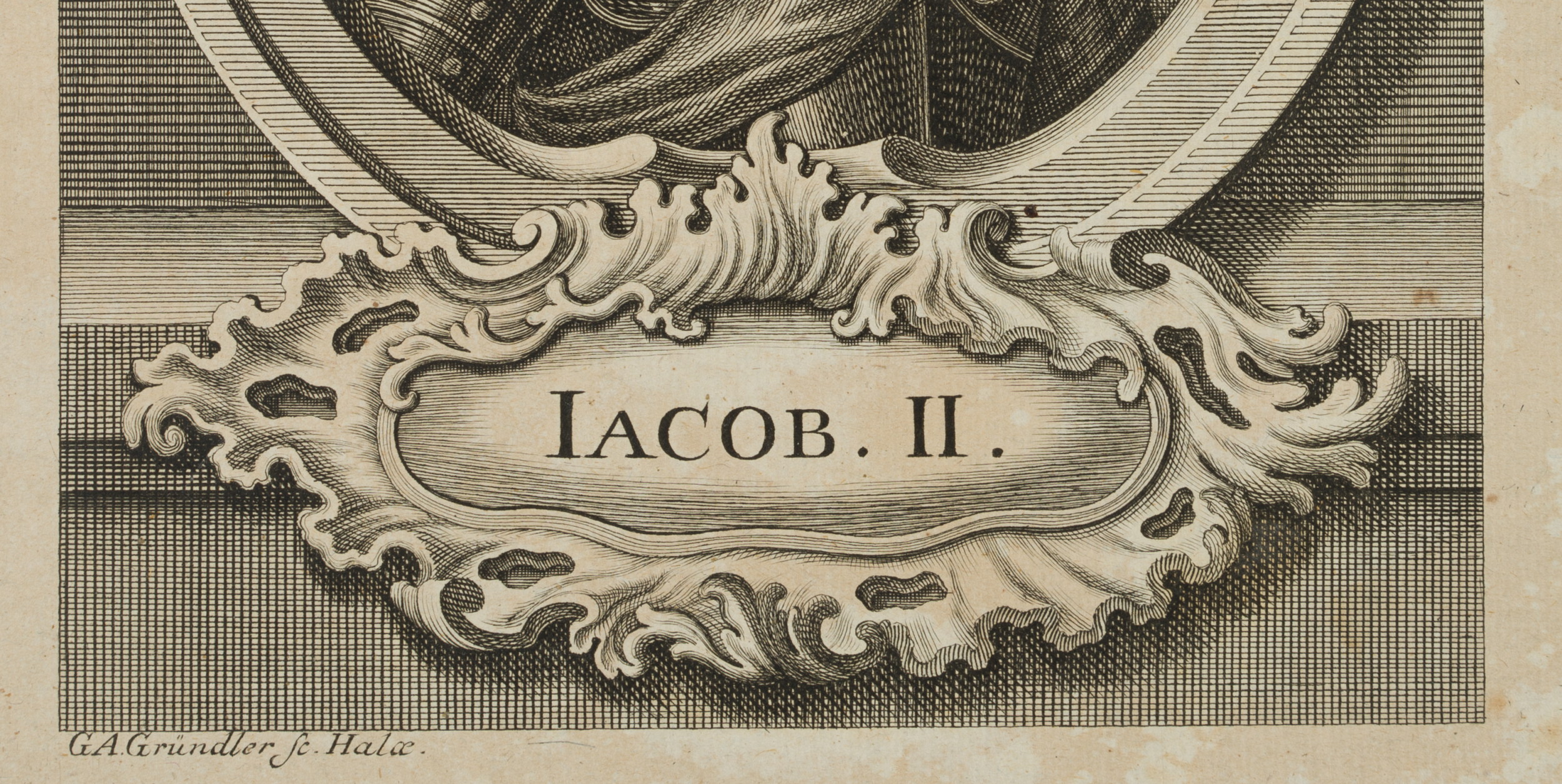 - Inscription: lower left signed in the printing plate: “G. A. Gründler sc. Halae”. Lower middle inscribed in the printing plate: “Iacob. II.”.