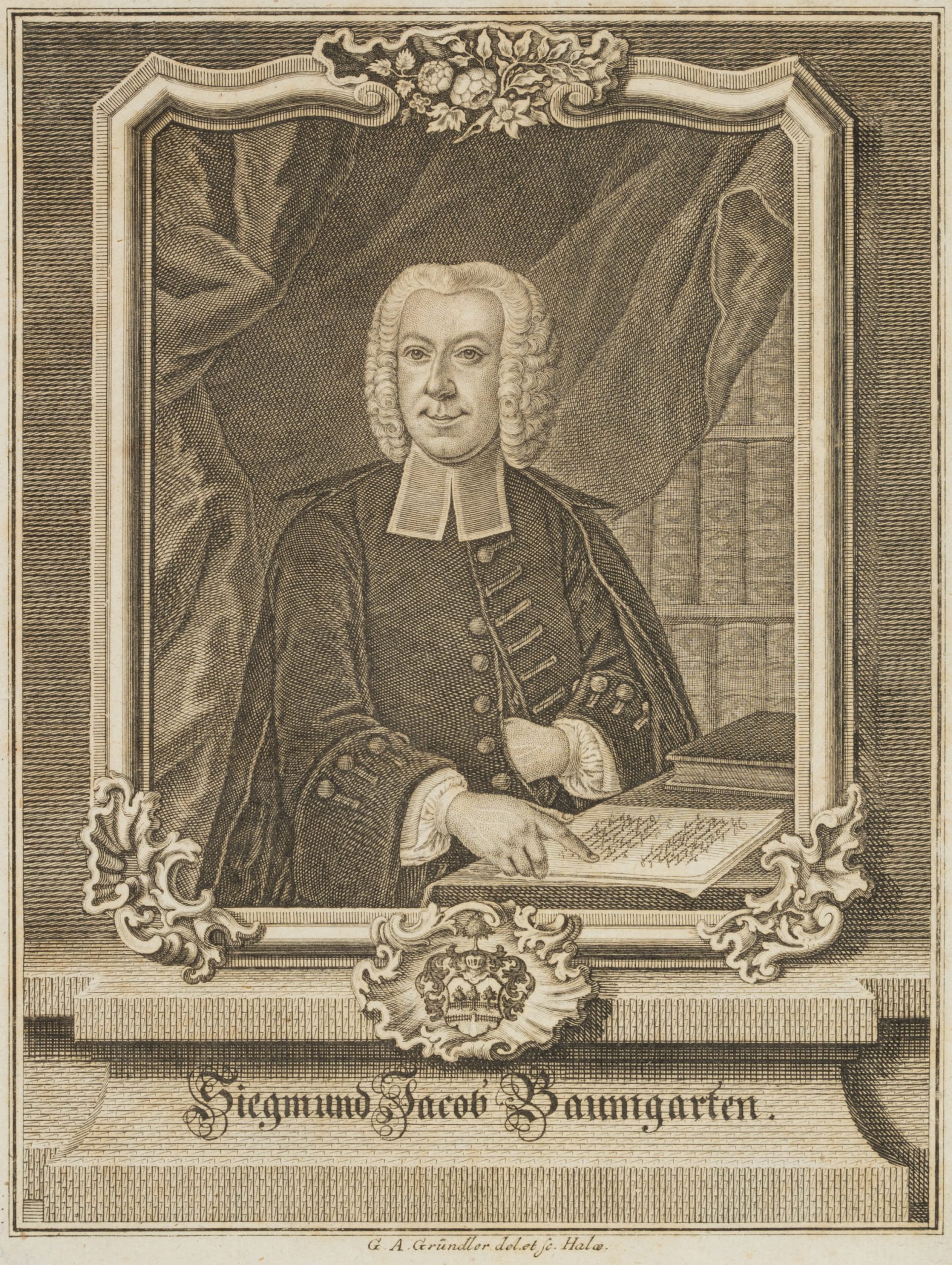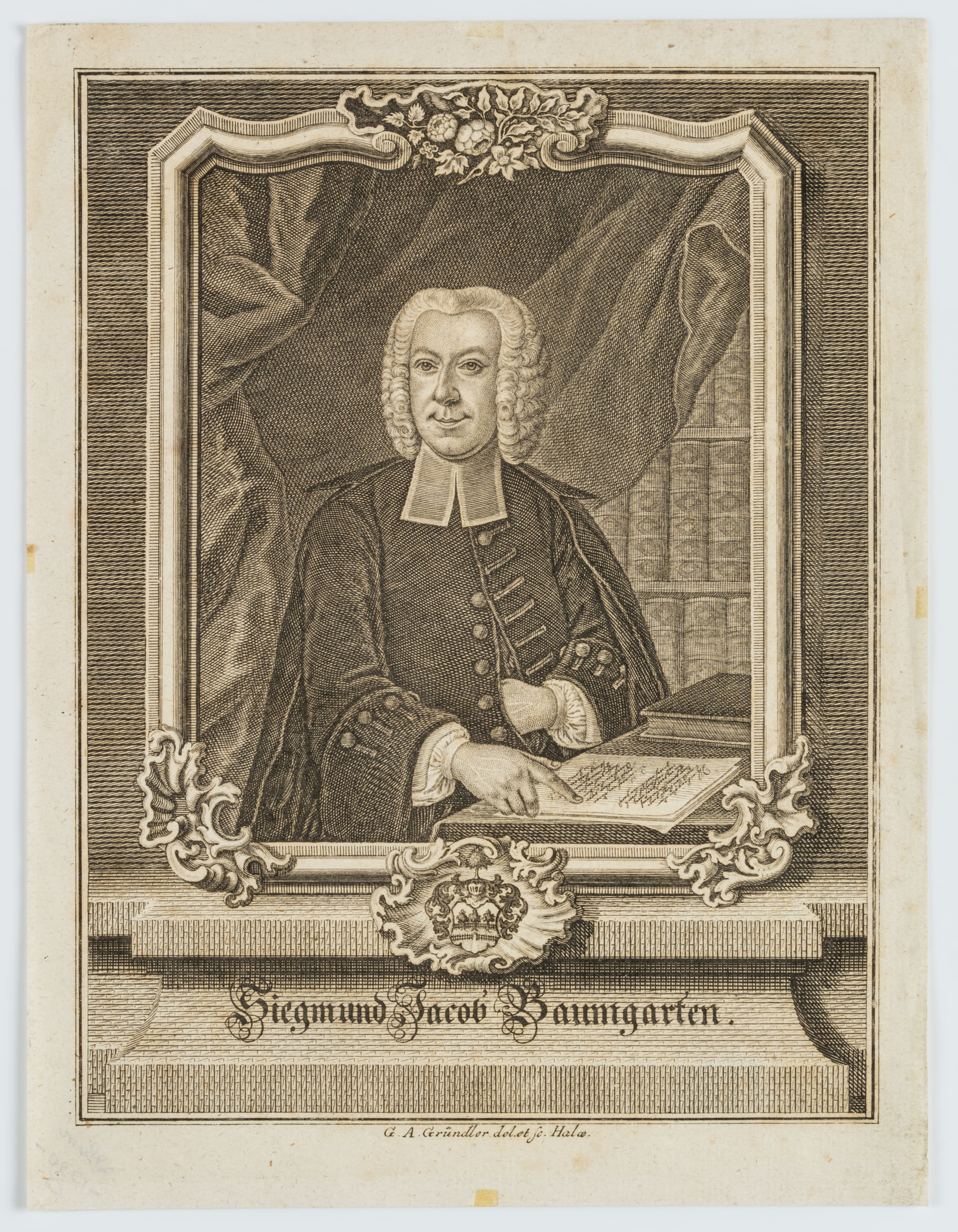 - Beschreibung: Oberkörperportrait des protestantischen Theologen und Wegbereiters der historisch-kritischen Bibelwissenschaft Siegmund Jakob Baumgarten mit gelockter Perücke und Beffchen an einem Tisch ein Schriftstück studierend. Der offene Blick ist dem Betrachter zugewandt, hinter ihm erlaubt ein zurückgeschobener Vorhang den Blick auf einige Buchrücken. Das Portrait beruht auf einem Gemälde von Johann Christian Heinrich Sporleder von 1757, das sich heute in Besitz der Martin-Luther-Universität Halle-Wittenberg befindet.