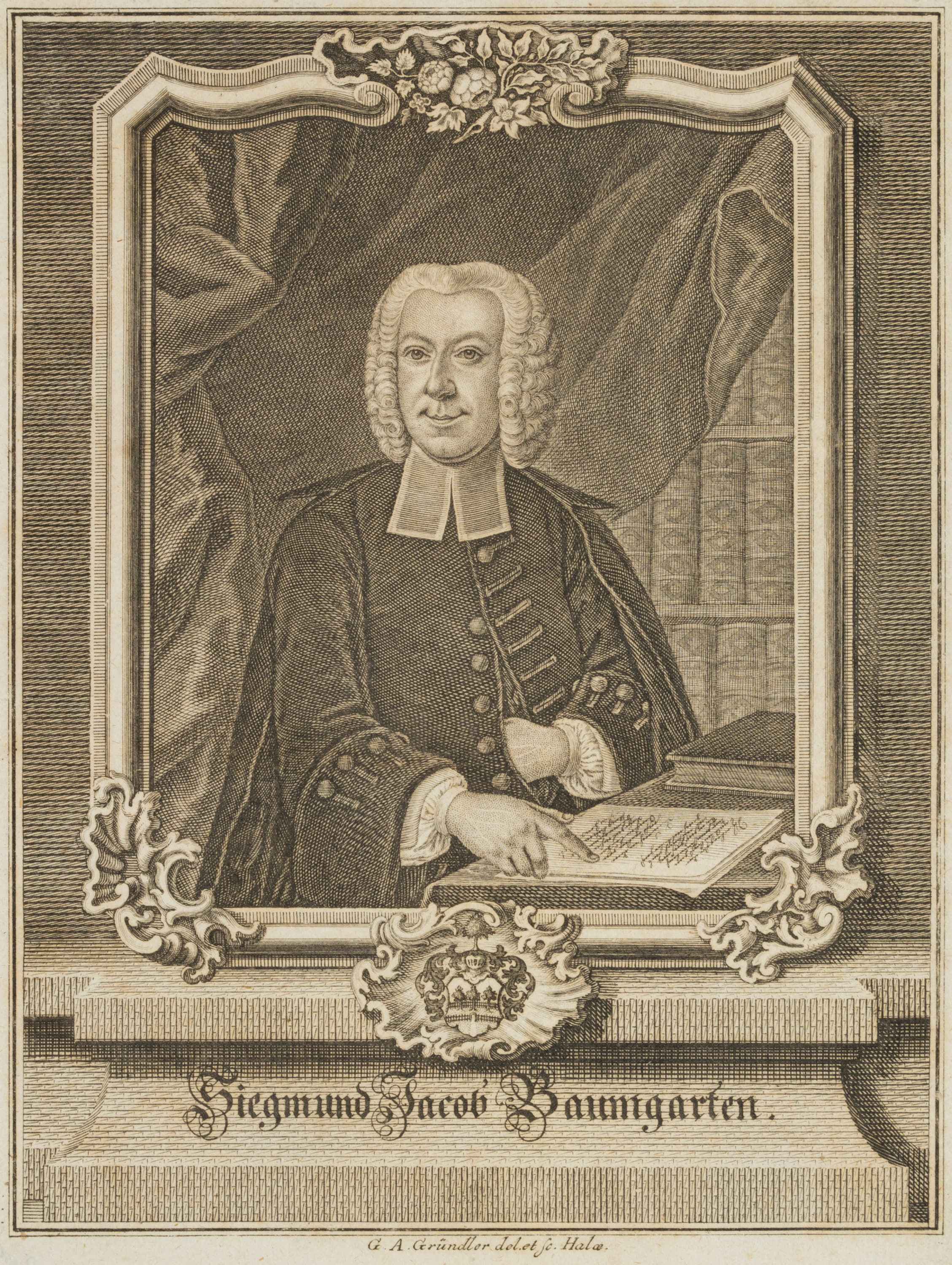 - Description: Portrait of the Protestant theologian and pioneer of historical-critical biblical scholarship, Siegmund Jakob Baumgarten, wearing a curly wig and a small hat, studying a book at a table. His open gaze is turned towards the viewer, behind him a curtain that has been pushed back allows a view of some book spines. The portrait is based on a painting by Johann Christian Heinrich Sporleder from 1757, which is now in the possession of the Martin Luther University Halle-Wittenberg.
