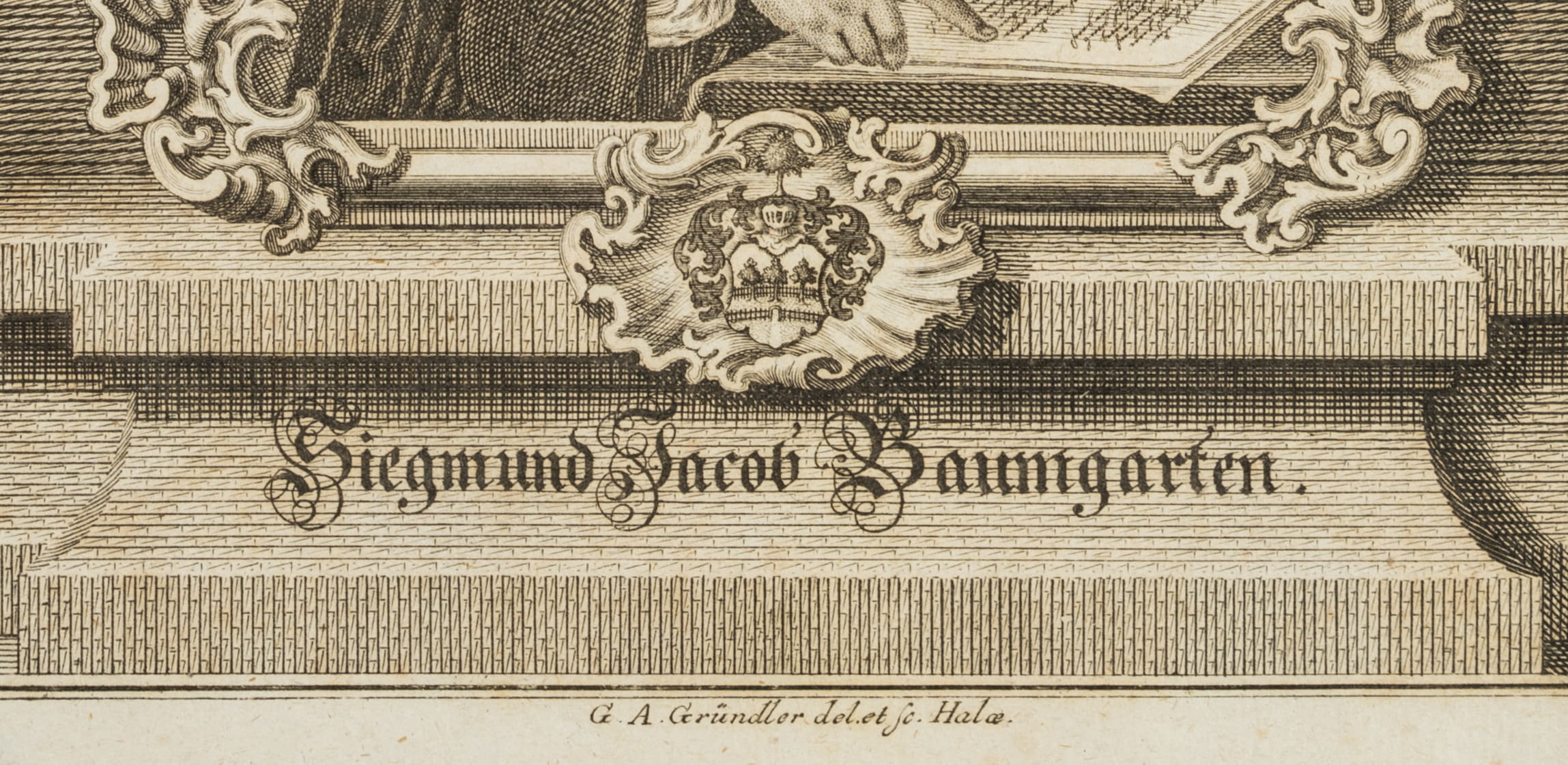 - Bezeichnung: Unterhalb der Darstellung in der Druckplatte signiert: “G. A. Gründler del. et sc. Halæ”