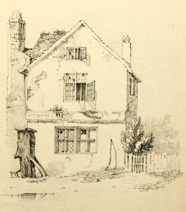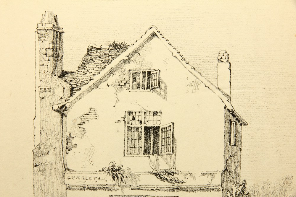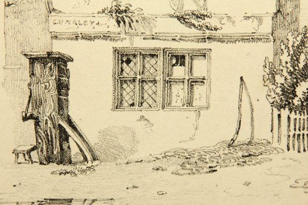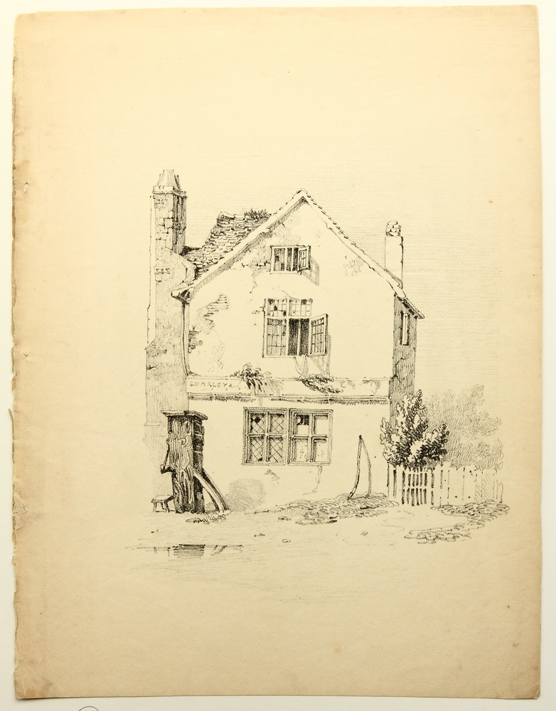- Description: View of a picturesque multi-storey residential house with stone cross-bar windows and fenced garden. The sheet is attributed to George Harley and dated 1819.On the reverse is the stamp of the collection of Rolf Armin Winkler, the author of the standard workDie Frühzeit der deutschen Lithographie. Katalog der Bilddrucke von 1796-1821, Munich 1975.