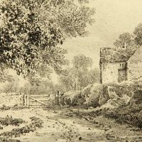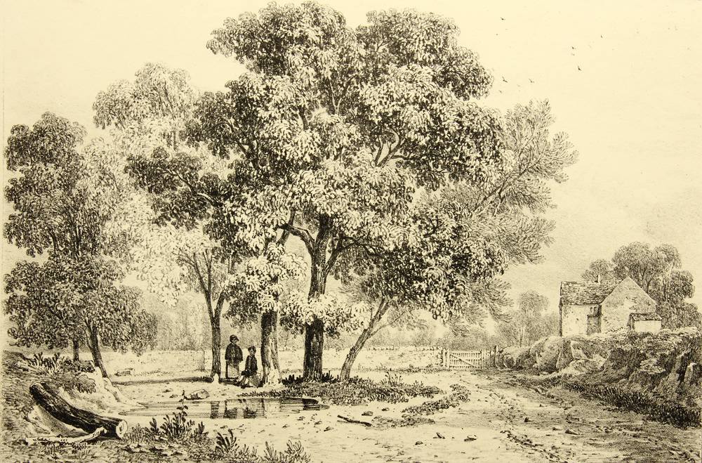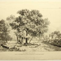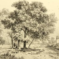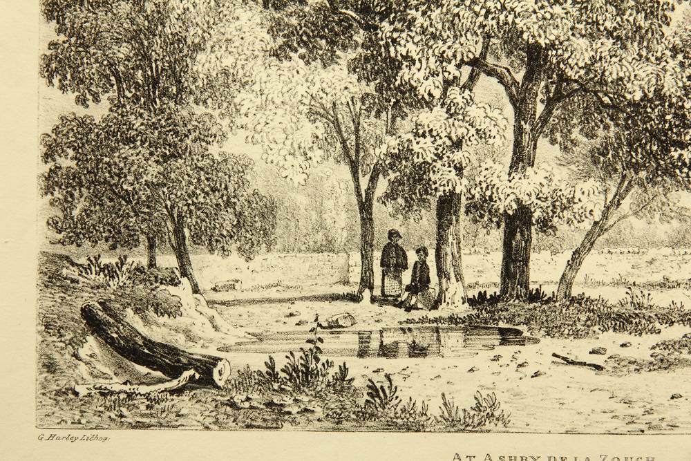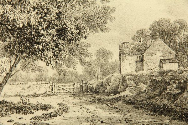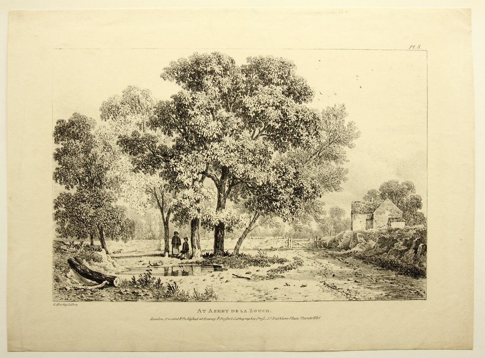 - Bezeichnung: Links unterhalb der Darstellung befindet sich im Stein die Signatur des Künstlers. Darunter ist die Darstellung betitelt mit “At Ashby de la Zouch” und mit Hinweisen zum Verlag bei Rowney & Forster’s in London versehen sowie auf 1821 datiert. Das Blatt ist mit “Pl.8” nummeriert und stammt aus George Harleys ReiheFirst Lessons of Landscapeaus dem jahr 1821.Rückseitig befindet sich der Stempel der Sammlung von Rolf Armin Winkler, dem Autor des StandardwerkesDie Frühzeit der deutschen Lithographie. Katalog der Bilddrucke von 1796-1821, München 1975.