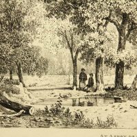 - Description: Idyllic depiction of nature in a small park with a road and a pond at a simple cottage. At the pond two children are resting in the shade of the trees.