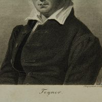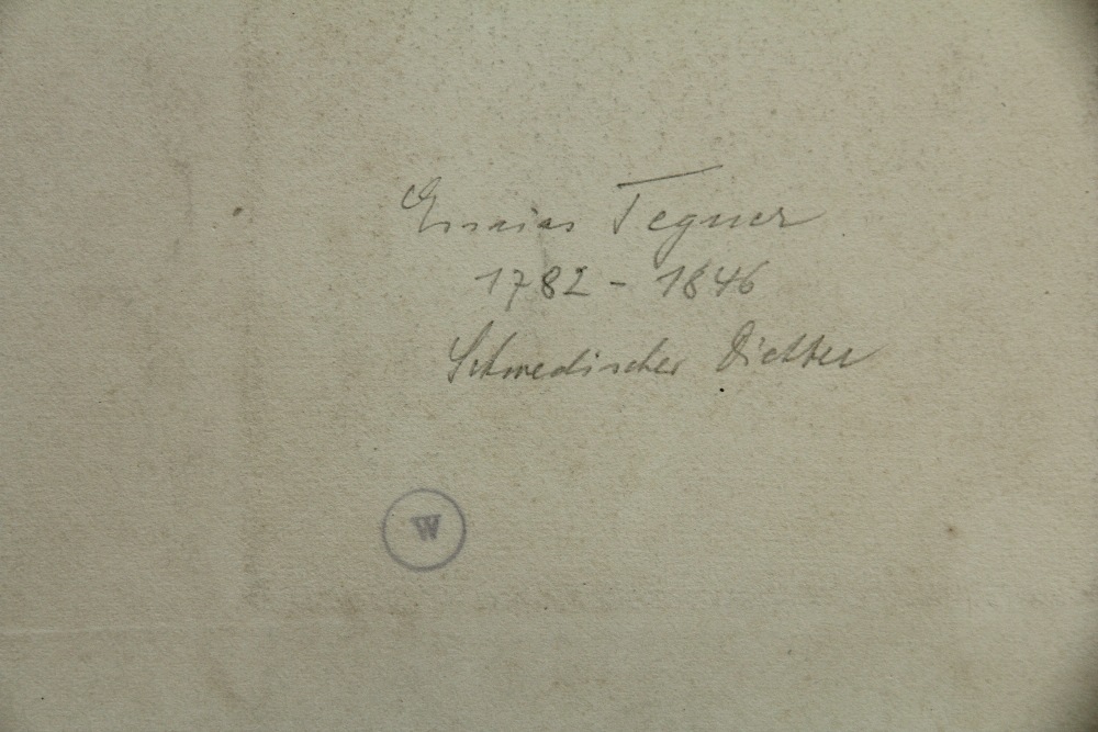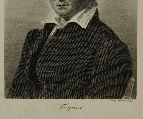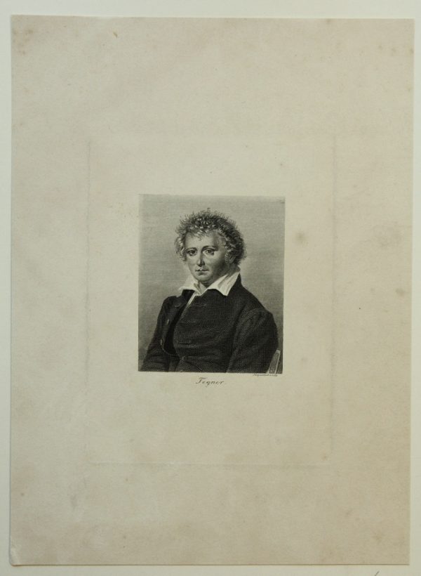 - Description: Georges Franois Louis JAQUEMOT (1806 Valangin – 1880 Pforzheim), Half-length portrait sitting of Esaias Tegnr (1782 Kyrkerud – 1846 Växjö), Swedish poet and Lutheran bishop in the diocese of Växjö, steel engraving. Description: Steel engraving on paper. Signed by the artist in the printing plate below the image and with the name of the sitter. On the reverse a collection stamp with the letter “W”.