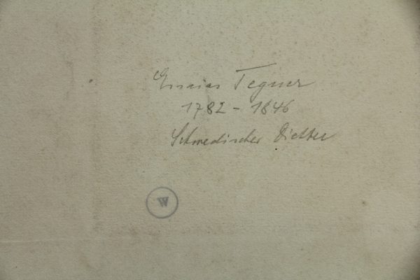 - Beschreibung: Georges François Louis JAQUEMOT (1806 Valangin – 1880 Pforzheim), Brustbild im Sitzen des Esaias Tegnér (1782 Kyrkerud – 1846 Växjö), Schwedischer Lyriker und lutherisch-evangelischer Bischof im Bistum Växjö, Stahlstich. Beschreibung: Stahlstich auf Papier. Unterhalb der Darstellung in Druckplatte vom Künstler signiert sowie mit dem Namen des Dargestellten versehen. Rückseitig befindet sich ein Sammlungsstempel mit dem Buchstaben “W”.
