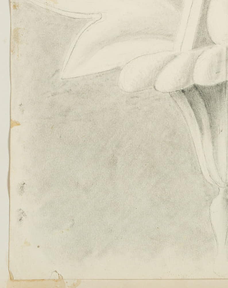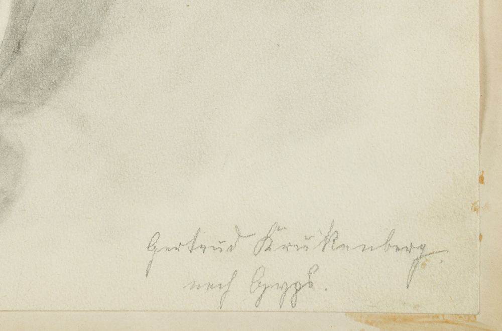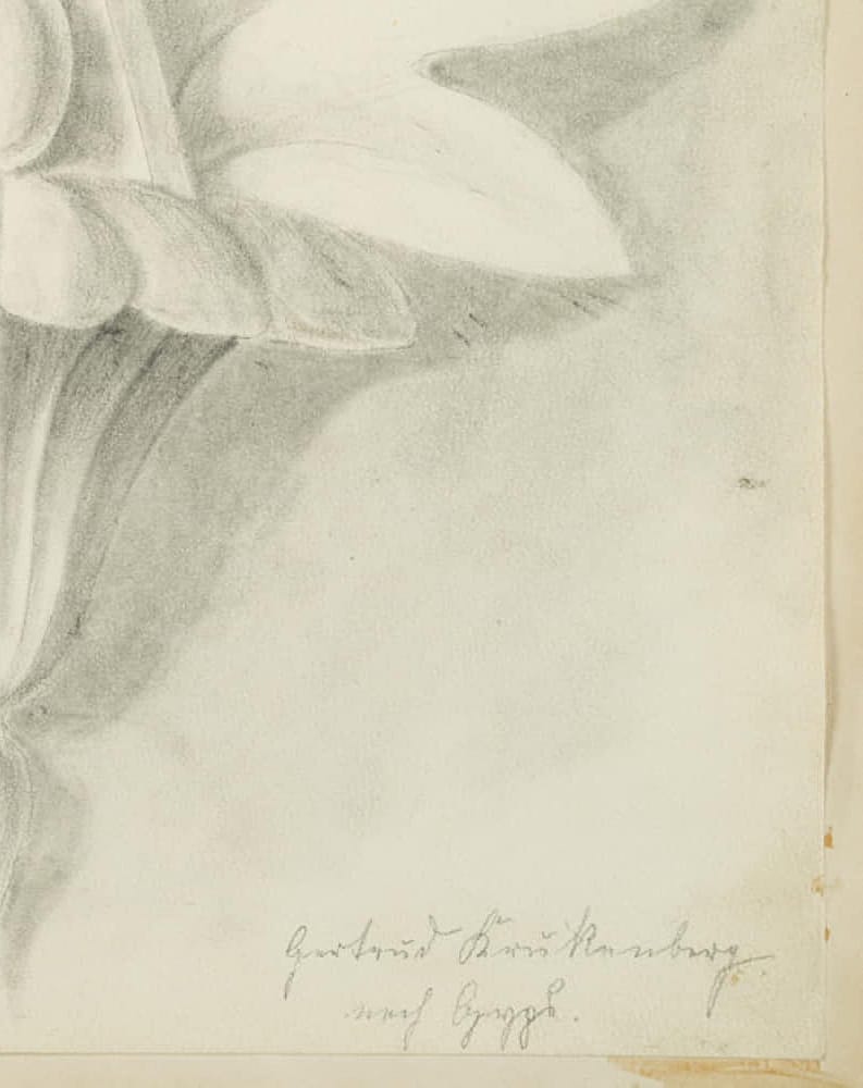 - Description: With an eye for light and shadow, the artist drew this architectural ornamental element from the work of an artist. The spatial effect is so great that the element can supposedly be removed from the work. Signed and inscribed at lower right: “Gertrud Krukenberg / after ?”. The work is glued onto another sheet of paper.