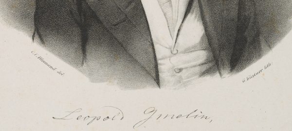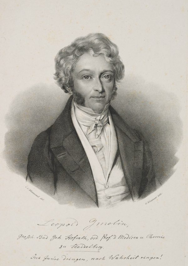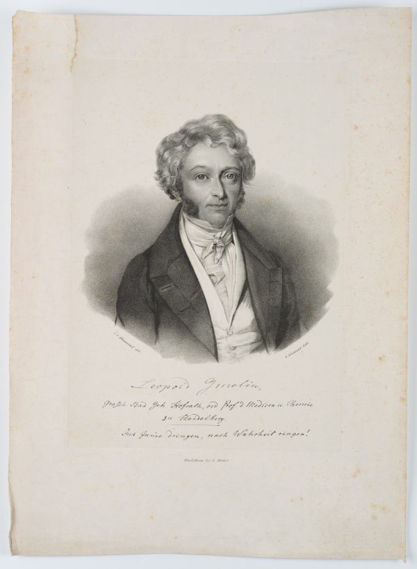 - Description: Directly below the portrait the artist’s addresses, below center probably the reprint of a manuscript with four German lines, therein information about the sitter: “Leopold Gmelin, | Grossh. Bad. Geh. Hofrath, ord. Prof. d. Medicin u. Chemie | zu Heidelberg. Penetrate inside, strive for truth!