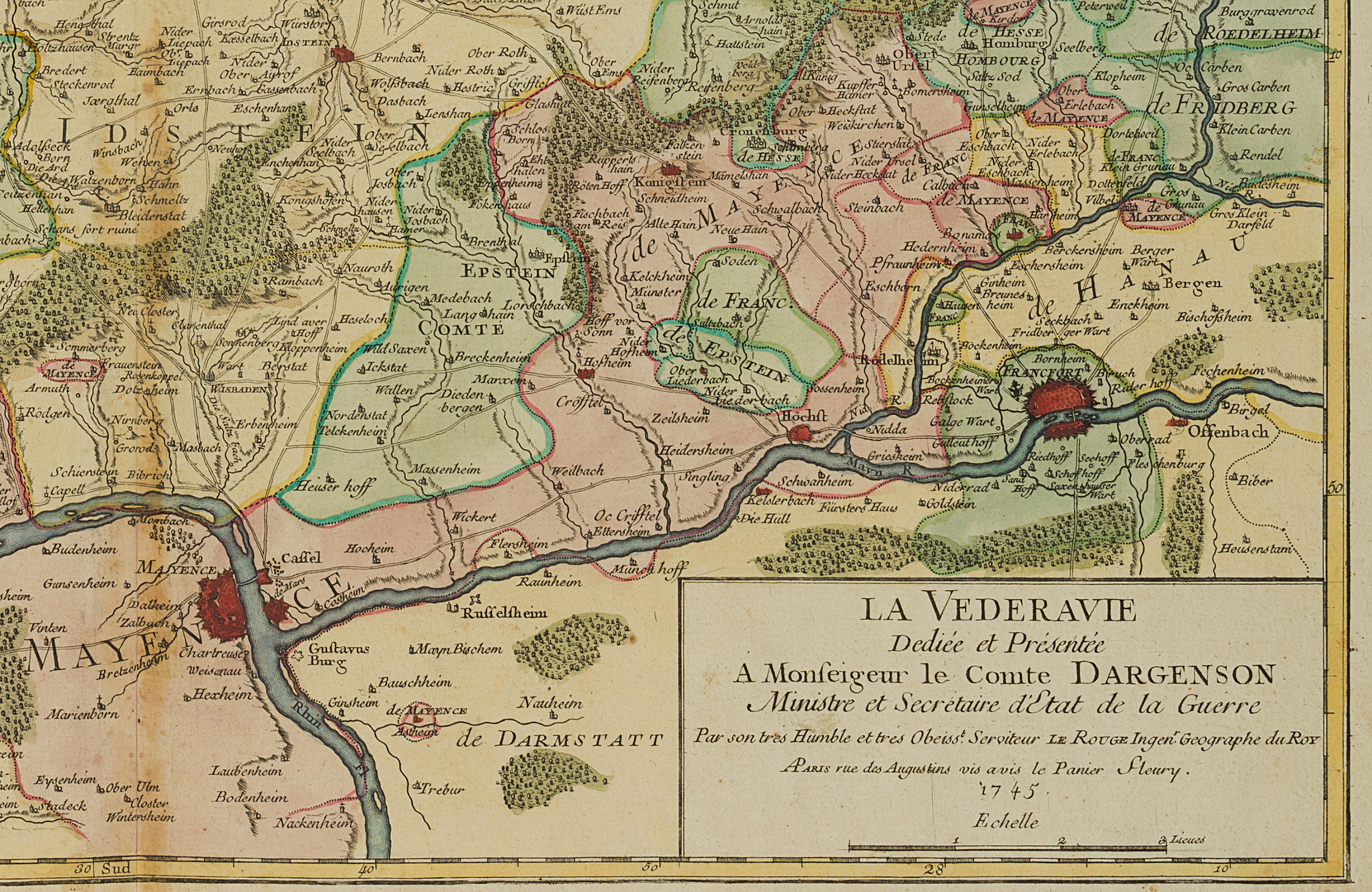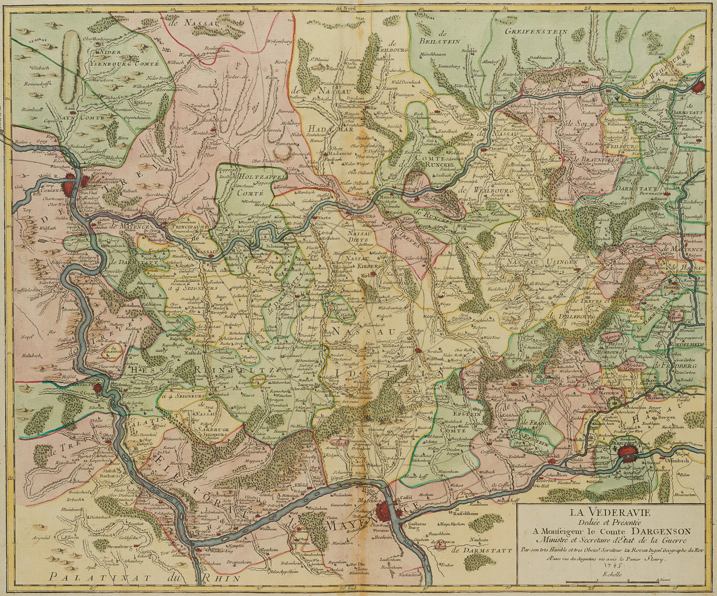 • Bezeichnung: Unten rechts im Druck bezeichnet: “La Vederavie Dediée et Présentée A Monseigneur le Comte Dargenson Ministre et Secretaire d’Etat de la Guerre Par son trés Obeisst. Serviteur Le Rouge Ingenr. Geographe du Roy A Paris rue des Augustins vis a vis le Panier Fleury. 1745”.