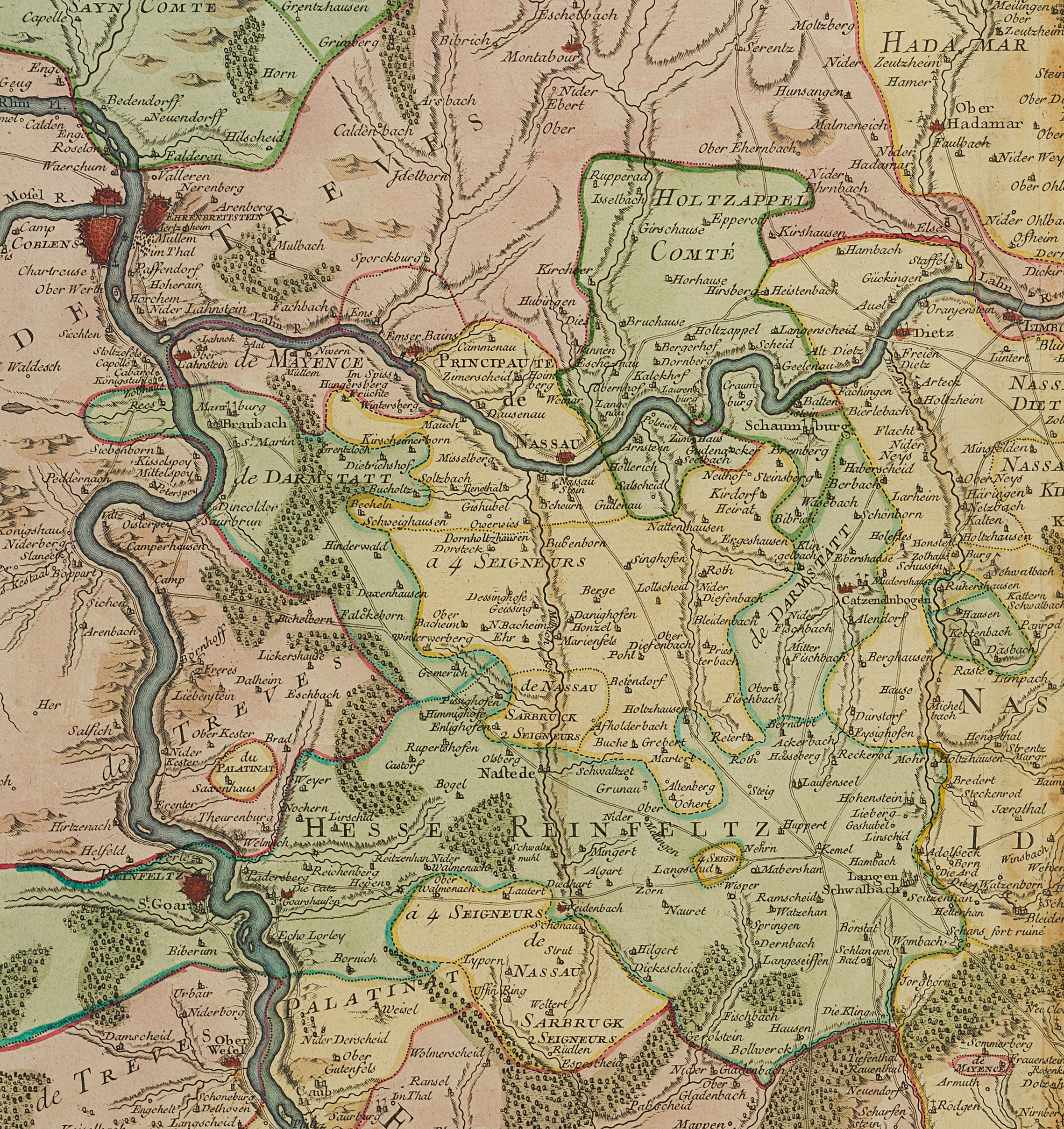 • Schlagworte: Topographie, Kartographie, Weilburg, Nassau, Mainz, Rheinland-Pfalz, Hessen, Frankfurt am Main, Hanau, Rheinfels, Eppstein, Idstein, Rhein, Lahn, Main, Landkarten, Deutschland, Mainz, Klassizismus, 1700-1749