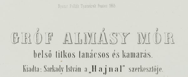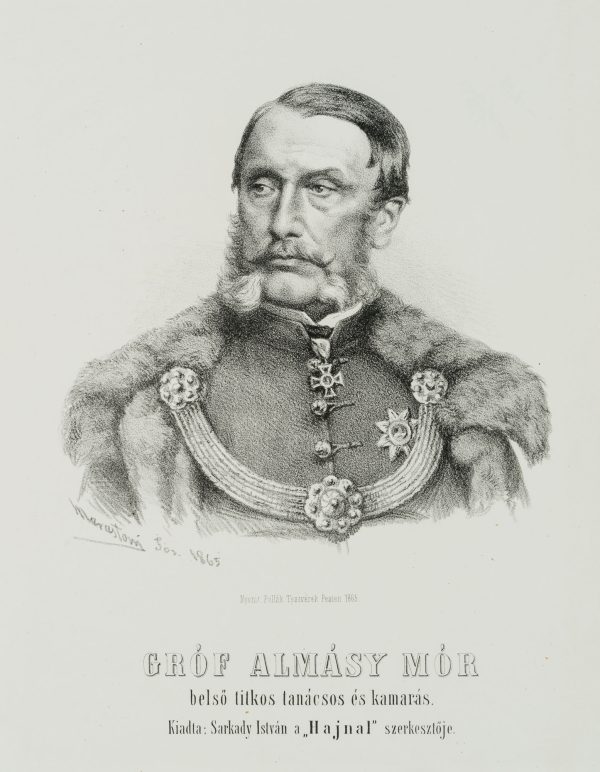 - Inscription: Signed by hand and dated “Marastoni 1865” on the left below the image, inscribed with the sitter’s name “Gróf Almásy Mór” below. Numbered “1271” on the verso and illegibly inscribed with the name of the collection.
