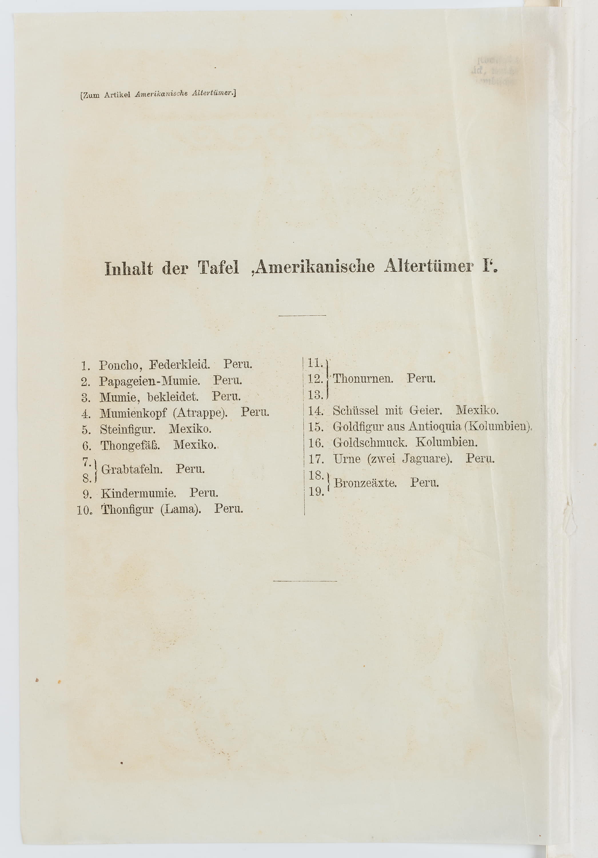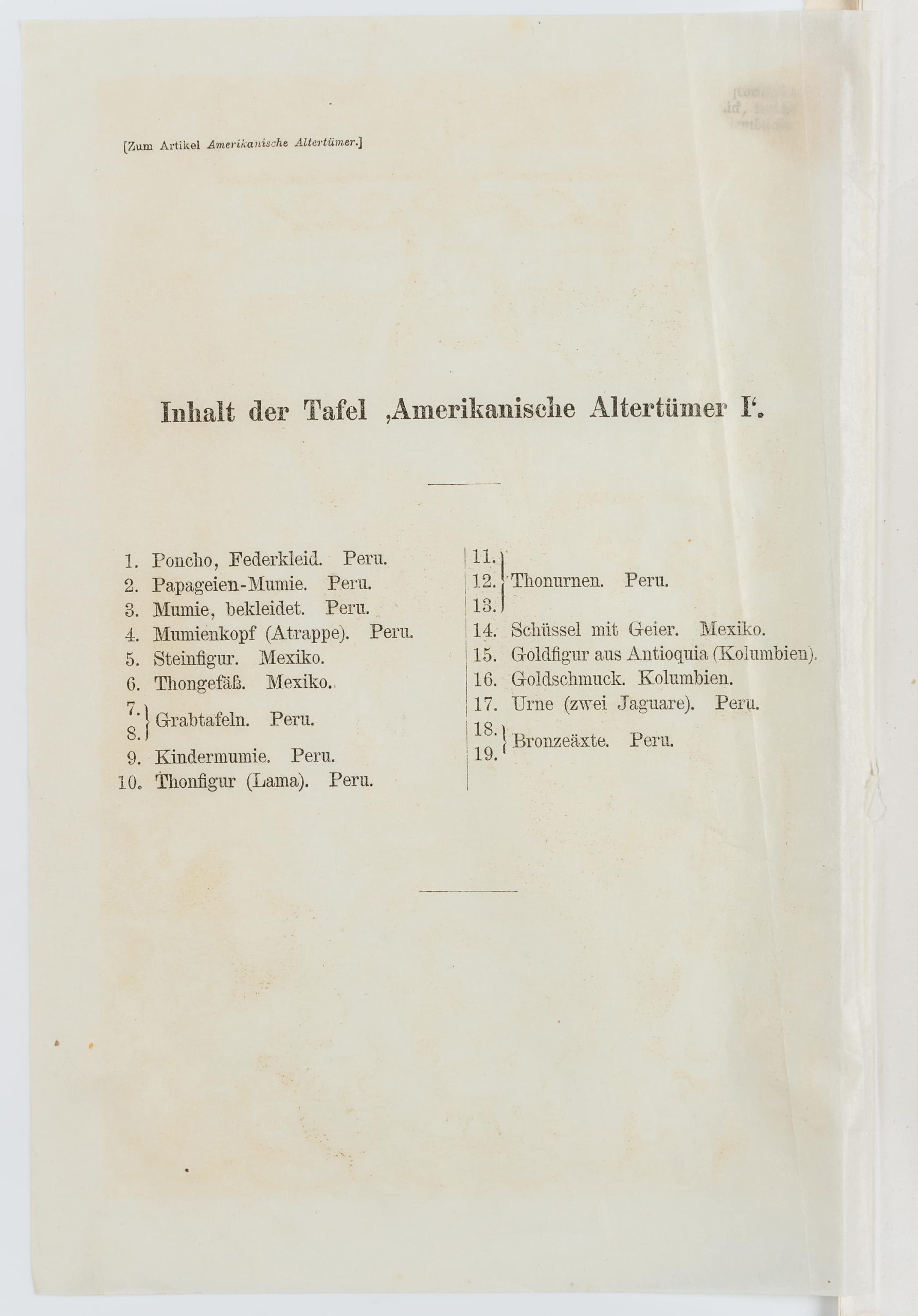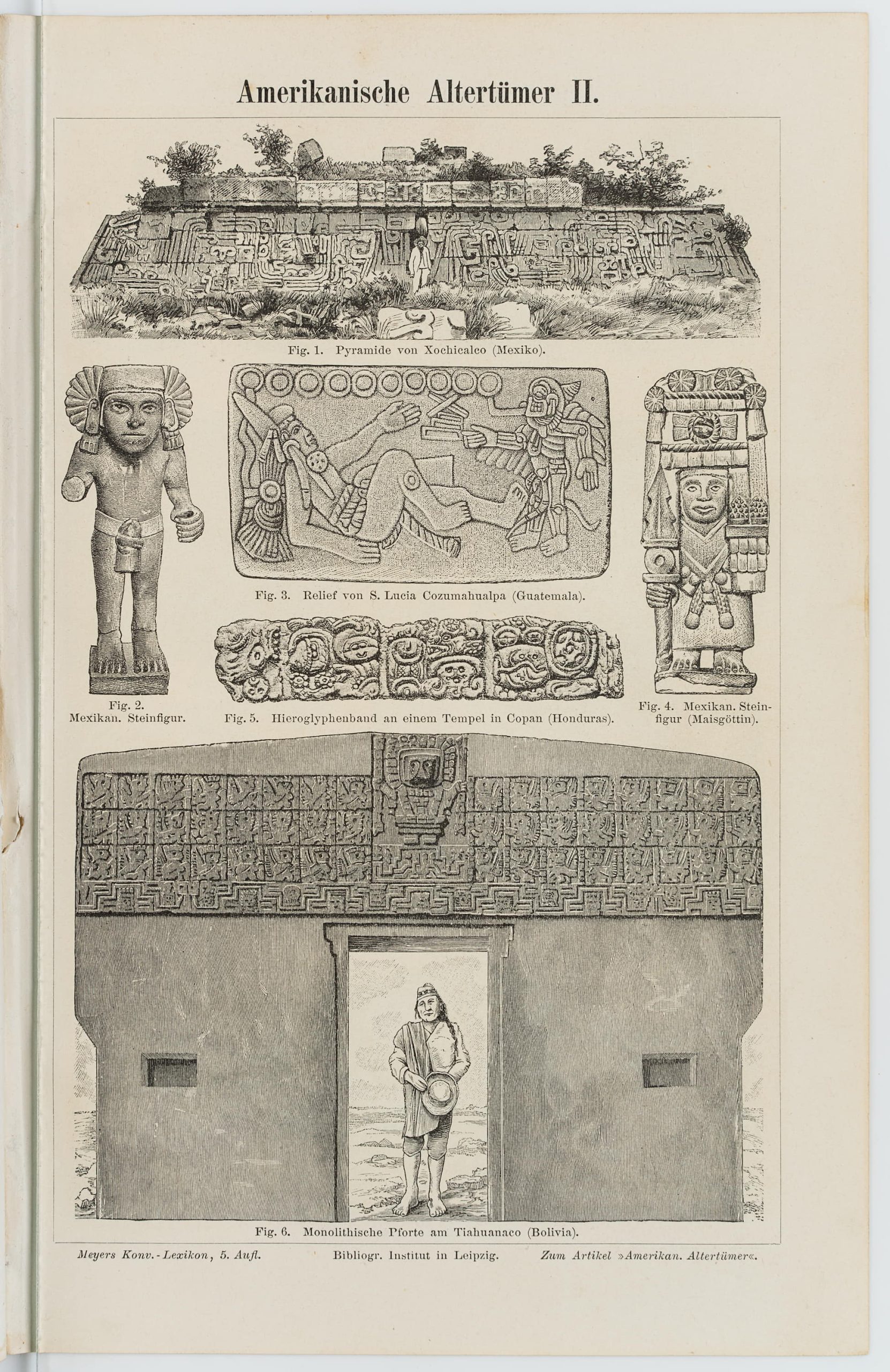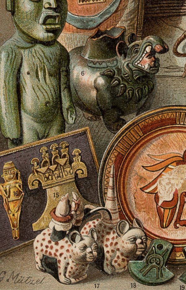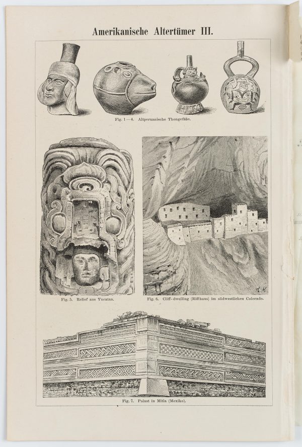 - Inscription: lower left signed in the printing plate: “G Mützel”. At the lower part inscribed on the support: “Meyers Konv.-Lexikon, 5. Aufl. | Bibliographisches Institut in Leipzig | Zum Artikel “Amerik. Altertümer””.