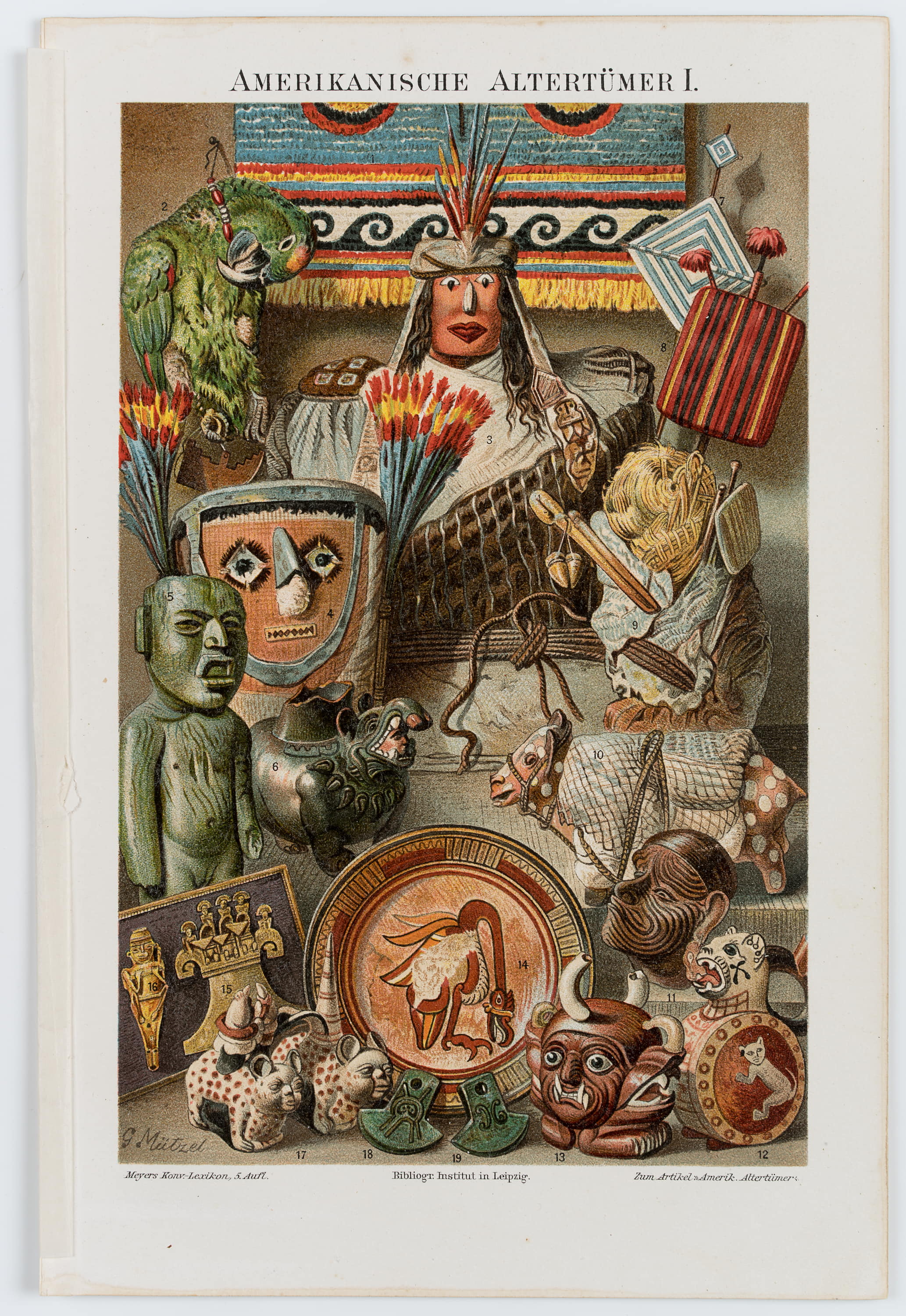 - Bezeichnung: Unten links im Druck signiert: “G Mützel”. Unten auf der Unterlage bezeichnet: “Meyers Konv.-Lexikon, 5. Aufl. | Bibliographisches Institut in Leipzig | Zum Artikel “Amerik. Altertümer””.