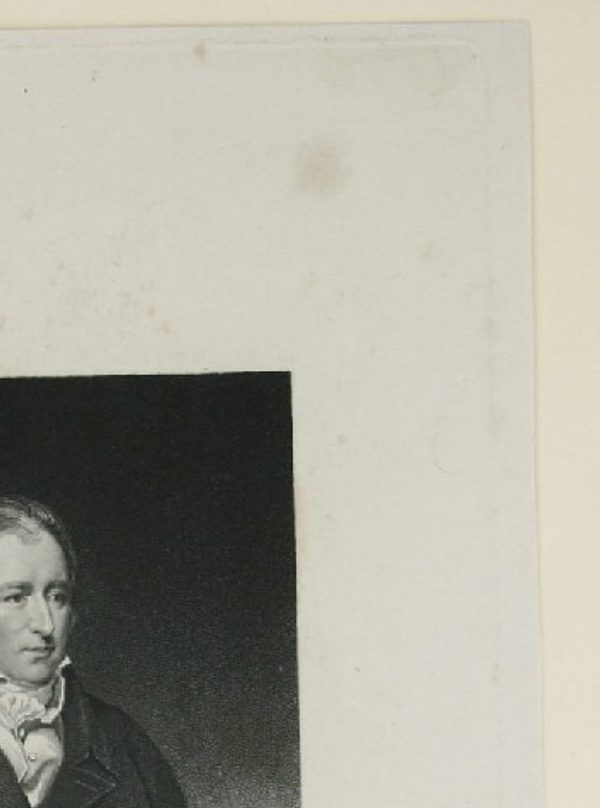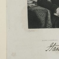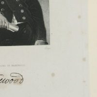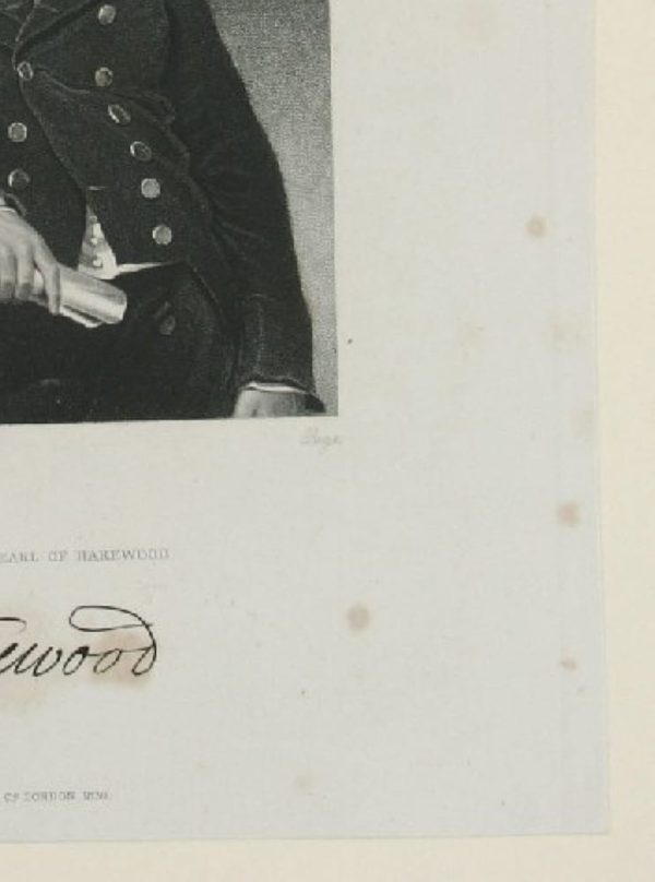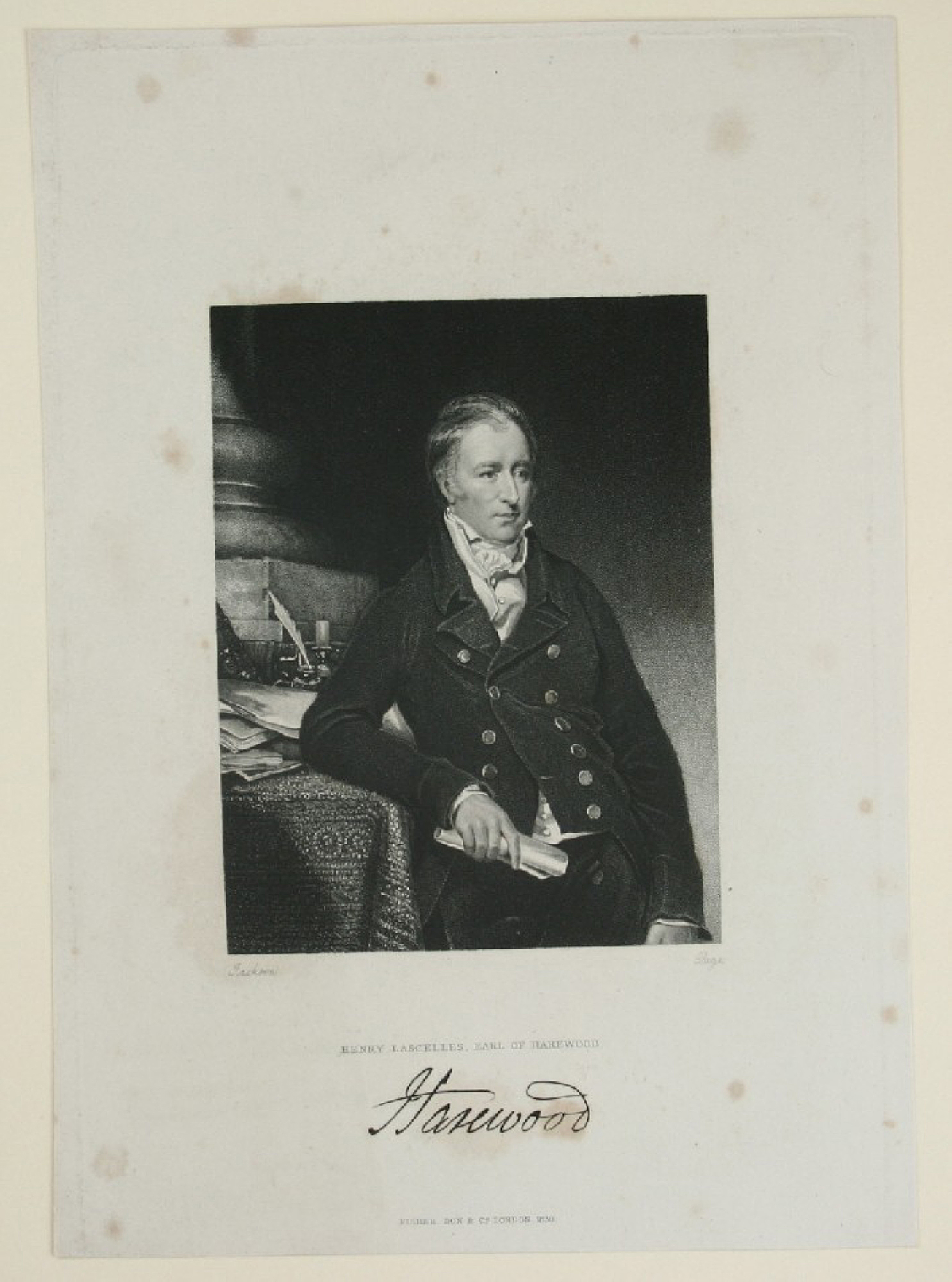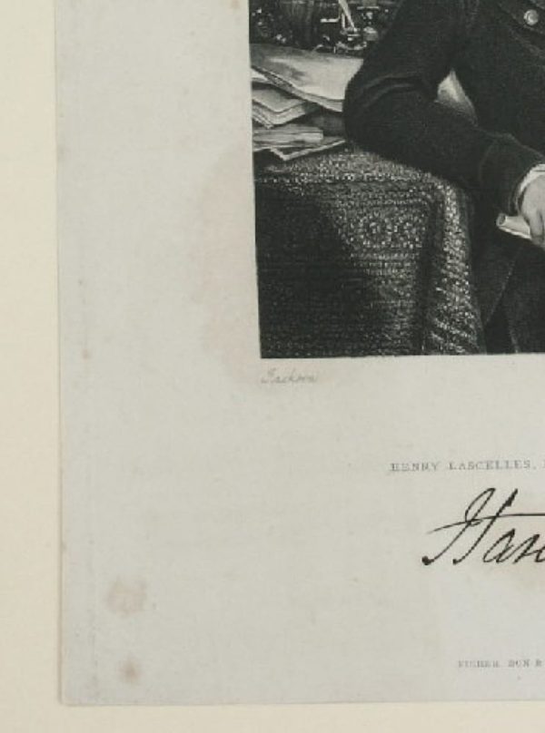 - Description: Stippling by Page after Jackson, inscribed: “Jackson Page Henry Lascelles, Earl of Harewood Fisher. Son & C° London 1830”. Very high quality steel engraving of Henry Lascelles as a hip portrait. Wearing black doublet and white shirt, Lascelles leans on a table with his elbow, holding a roll of paper in his hand. Calmly, Lascelles gazes into the distance. Behind him, some papers lie on the table in front of an inkwell with a quill and a candle that has gone out. In the darkness of the room, the base of a mighty column can be made out. Henry Lascelles, 2nd Earl of Harewood (1767 – 1841) was a member of Parliament and known as Viscount Lascelles.