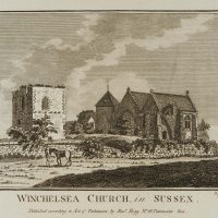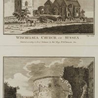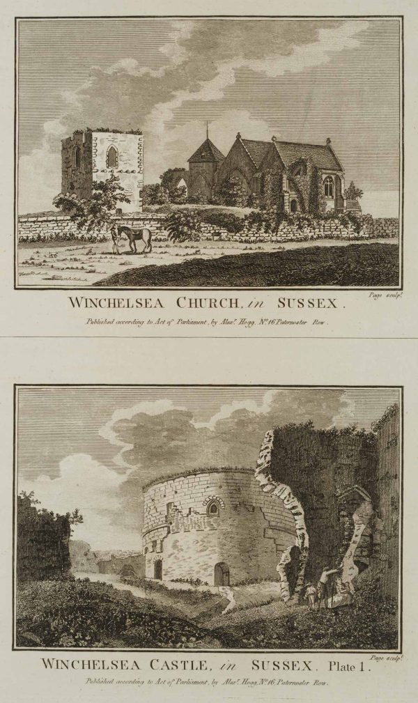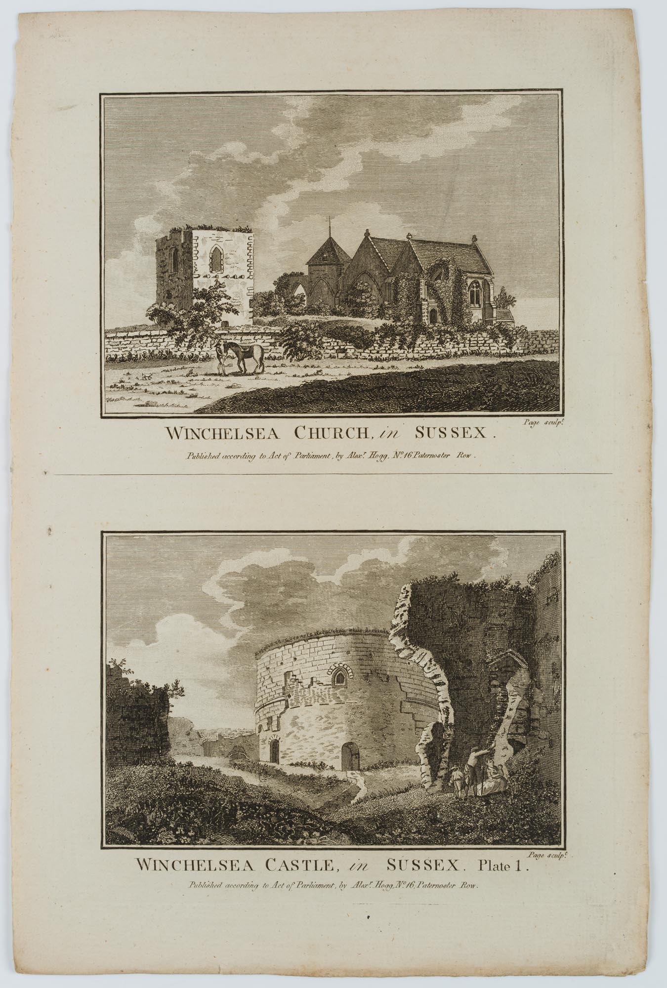 G. Page (19th century), Two landscape and architectural depictions: “Winchelsea Church, in Sussex”, “Winchelsea Castle, in Sussex Plate 1”, County, Brighton, 18th century, Etching