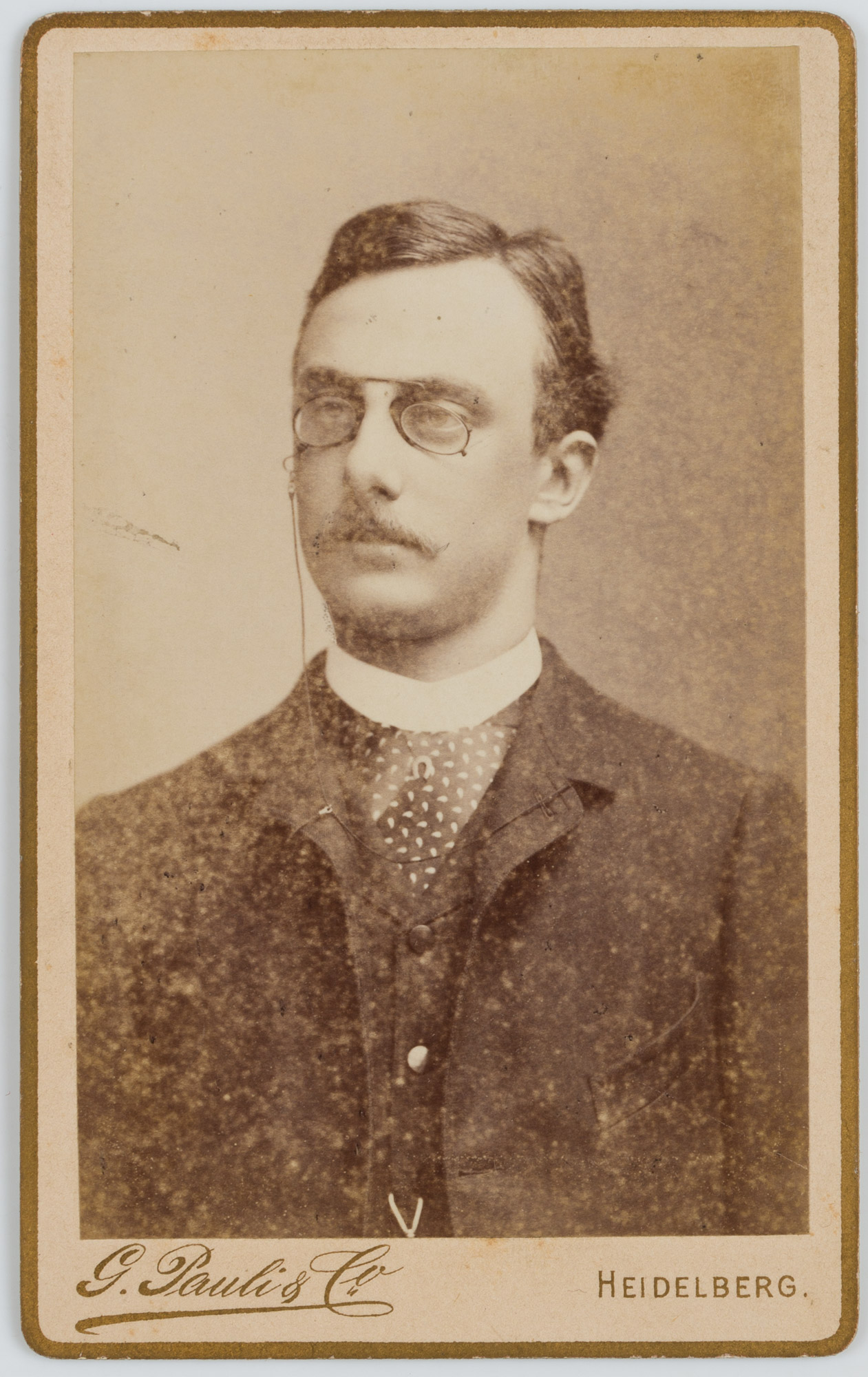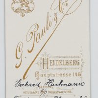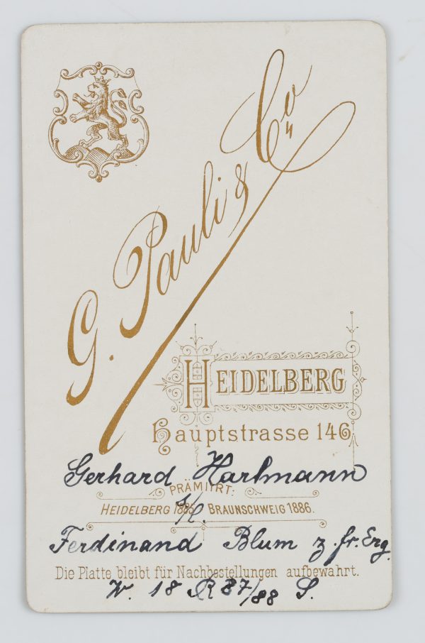 - Beschreibung: Unterhalb mit Adresse des Fotoateliers beschriftet: “G. Paulis Heidelberg”. Rückseitig handschriftlich beschriftet: Von Gerhard Hartmann für Ferdinand Blum. Die Fotografie stammt aus der Visitenkartensammlung von Ferdinand Blums (1865 – 1959), der Direktor des Biologischen Instituts in Frankfurt am Main war. Er forschte über Physiologie und Endokrinologie, besonders der Nebennieren, der Bauchspeicheldrüse und der Schilddrüse. Er entdeckte die blutzuckersteigernde Wirkung des Adrenalins. 1939 flüchtete er in die Schweiz.