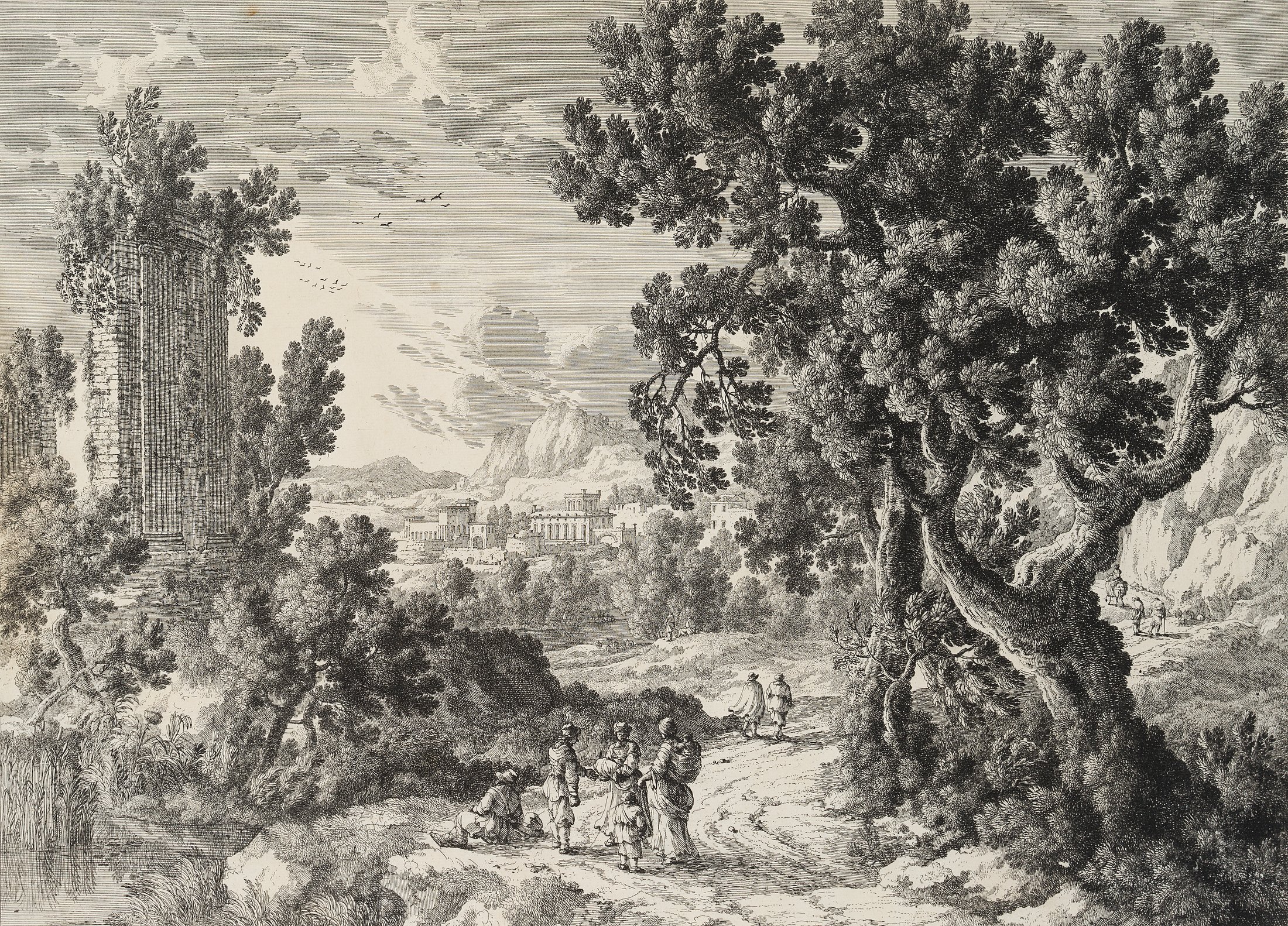 - Keywords: Printmaking, Ideal landscape, France, Ruin, Rock, City, Conversation, Way, Child, Woman, Man, 17th century, Romanticism, Landscapes, France,